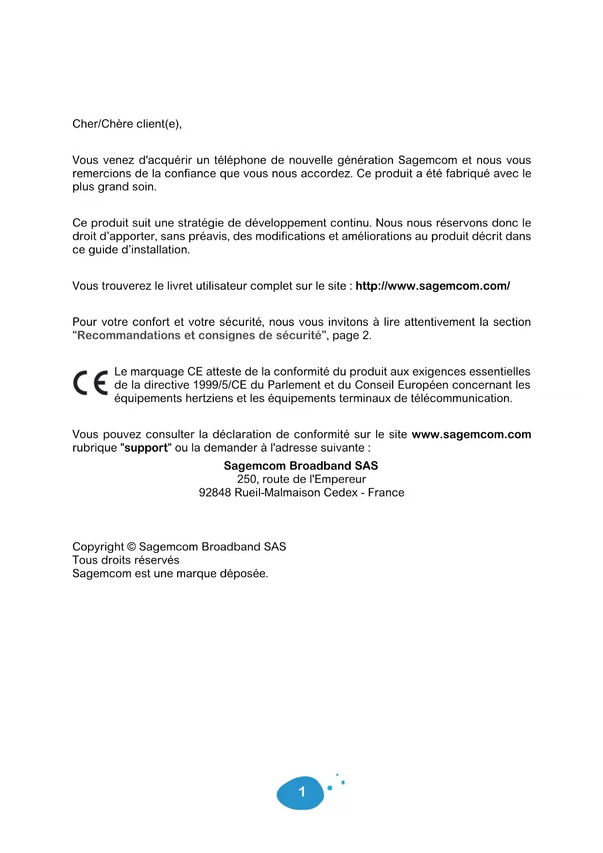 Manuel Utilisateur Couv1_4.fm Page 1 Jeudi, 24. février 2011 9:54 091 Cher/Chère client(e), Vous venez d'acquérir un téléphone de nouvelle génération Sagemcom et nous vous remercions de la confiance que vous nous accordez. Ce produit a été fabriqué avec le plus grand soin. Ce produit suit une stratégie de développement continu. Nous nous réservons donc le droit d’apporter, sans préavis, des modifications et améliorations au produit décrit dans ce guide d’installation. Vous trouverez le livret utilisateur complet sur le site : http://www.sage mcom.com/ Pour votre confort et votre sécurité, nous vous invitons à lire at tentivement la section “Recommandations et consignes de sécurité”, page 2. Le marquage CE atteste de la conformité du produit aux exigences essentielles de la directive 1999/5/CE du Parlement et du Conseil Européen concernant les équipements hertziens et les équipements terminaux de télécommunication. Vous pouvez consulter la déclaration de conformité sur le site www.sagemcom.com rubrique "support" ou la demander à l'adresse suivante : Sagemcom Broadband SAS 250, route de l'Empereur 92848 Rueil-Malmaison Cedex - France Copyright © Sagemcom Broadband SAS Tous droits réservés Sagemcom est une marque déposée.2 Recommandations et consignes de sécurité Pour votre sécurité ne placez jamais votre combiné sur la base sans ses batteries, ou sans sa trappe batterie, vous risquez un choc électrique. Pour ne pas risquer d'endommager votre combiné (ou votre base) et pour éviter les risques d'explosion, utilisez uniquement des batteries du type Ni-MH 1,2 V 650 mAh rechargeables homologuées de format AAA,