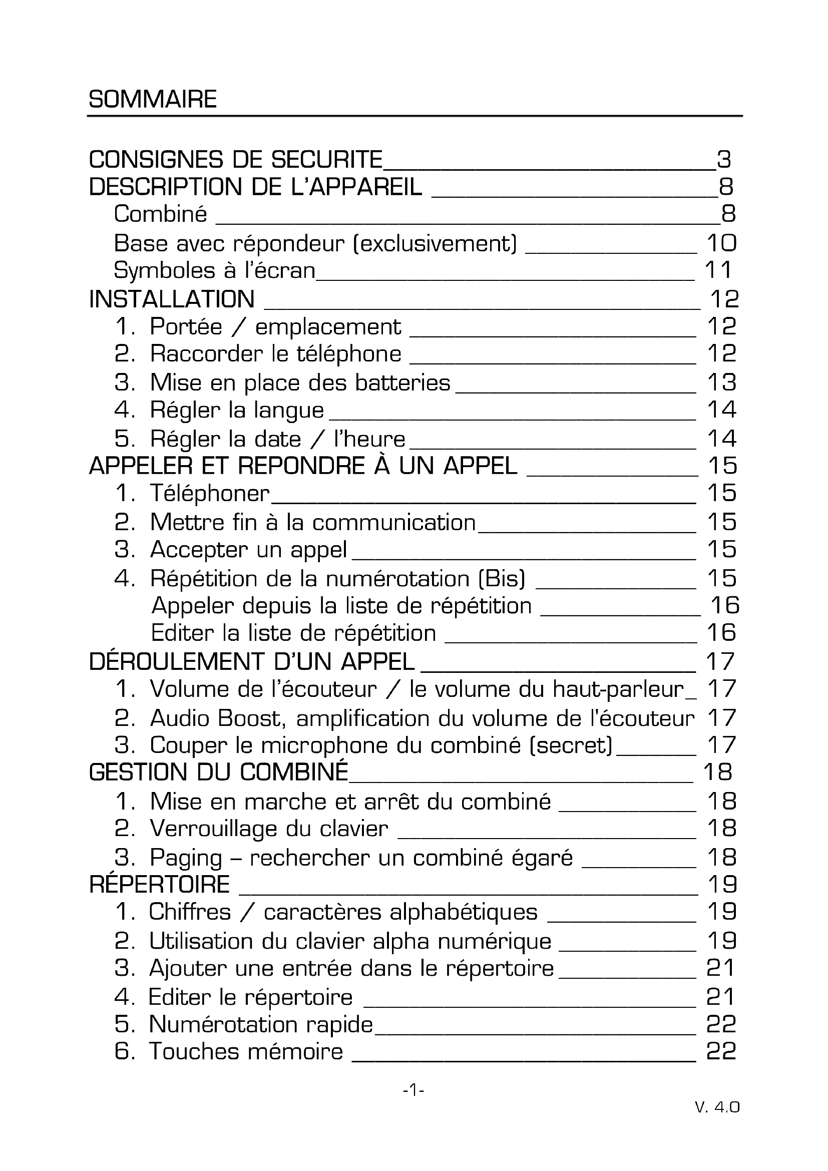 Remarque : Si votre répondeur n’accepte pas l’interrogation à distance, essayez de moduler la durée d’appui (plus ou moins longue ou courte) sur le clavier numérique. Votre répondeur réagit à des tonalités de 0,5 à 1 seconde.CARACTERISTIQUES TECHNIQUES Norme Technologie de téléphone sans fil numérique Portée en champ libre Jusqu'à 300 mètres * Portée en intérieur Jusqu'à 50 mètres * Autonomie du combiné (valeurs moyennes) 10 heures en conversation 100 heures en veille Batteries rechargeables Ni-MH Type R03 / AAA 2 x 1,2 V / 500 mAh Température de fonctionnement De 0 à 40 °C Adaptateur secteur de la base avec répondeur Modèle : S004LV0600045 Entrée : 100-240 V~ 50/60 Hz 150 mA Sortie : 6 V 450 mA Adaptateur secteur de la base sans répondeur Modèle : S004LV0600030 Entrée : 100-240 V~ 50/60 Hz 150 mA Sortie : 6 V 300 mA Adaptateur secteur du combiné supplémentaire Modèle : S004LV0600030 Entrée : 100-240 V~ 50/60 Hz 150 mA Sortie : 6 V 300 mA