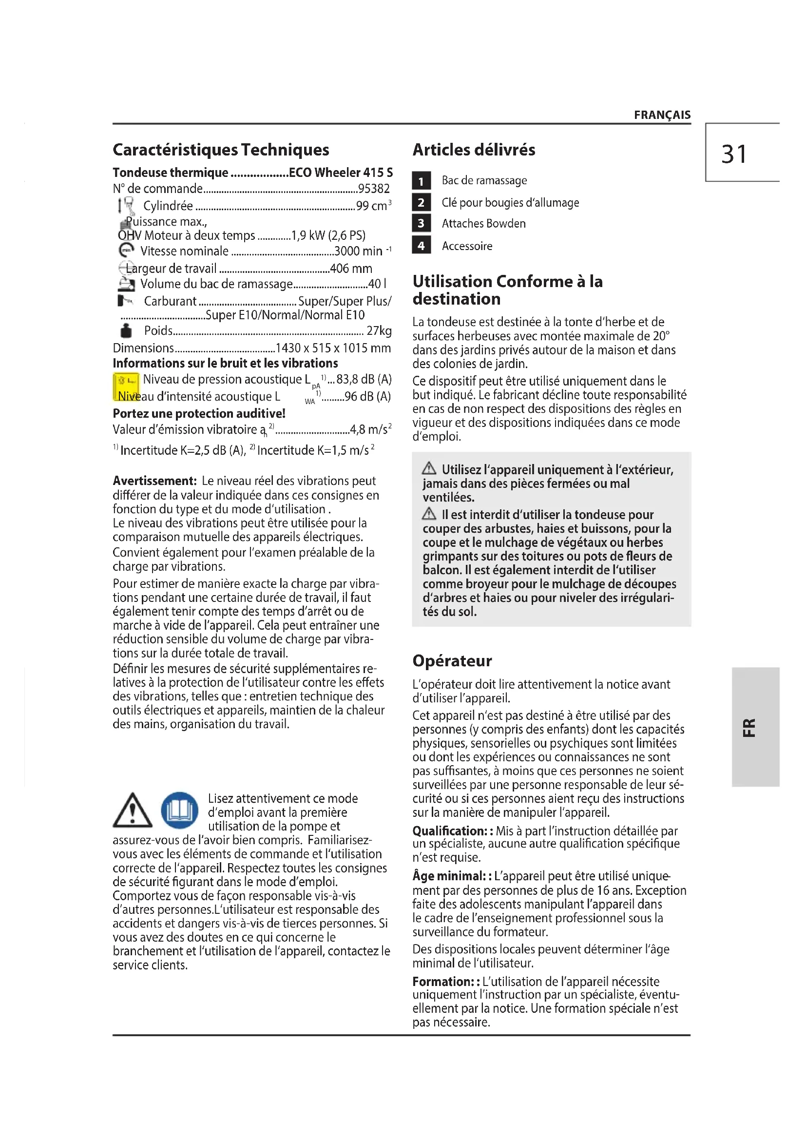 Accessoire Utilisation Conforme à la destination La tondeuse est destinée à la tonte d‘herbe et de surfaces herbeuses avec montée maximale de 20° dans des jardins privés autour de la maison et dans des colonies de jardin. Ce dispositif peut être utilisé uniquement dans le but indiqué. Le fabricant décline toute responsabilité en cas de non respect des dispositions des règles en vigueur et des dispositions indiquées dans ce mode d‘emploi. Utilisez l‘appareil uniquement à l‘extérieur, jamais dans des pièces fermées ou mal ventilées. Il est interdit d‘utiliser la tondeuse pour couper des arbustes, haies et buissons, pour la coupe et le mulchage de végétaux ou herbes grimpants sur des toitures ou pots de eurs de balcon. Il est également interdit de l‘utiliser comme broyeur pour le mulchage de découpes d‘arbres et haies ou pour niveler des irrégulari- tés du sol. Opérateur L’opérateur doit lire attentivement la notice avant d’utiliserl’appareil. Cet appareil n‘est pas destiné à être utilisé par des personnes (y compris des enfants) dont les capacités physiques, sensorielles ou psychiques sont limitées ou dont les expériences ou connaissances ne sont pas susantes, à moins que ces personnes ne soient surveillées par une personne responsable de leur sé- curité ou si ces personnes aient reçu des instructions sur la manièr e de manipuler l‘appareil. Qualication:: Mis à part l’instruction détaillée par unspécialiste, aucune autre qualication spécique n’estrequise. Âge minimal:: L’appareil peut être utilisé unique