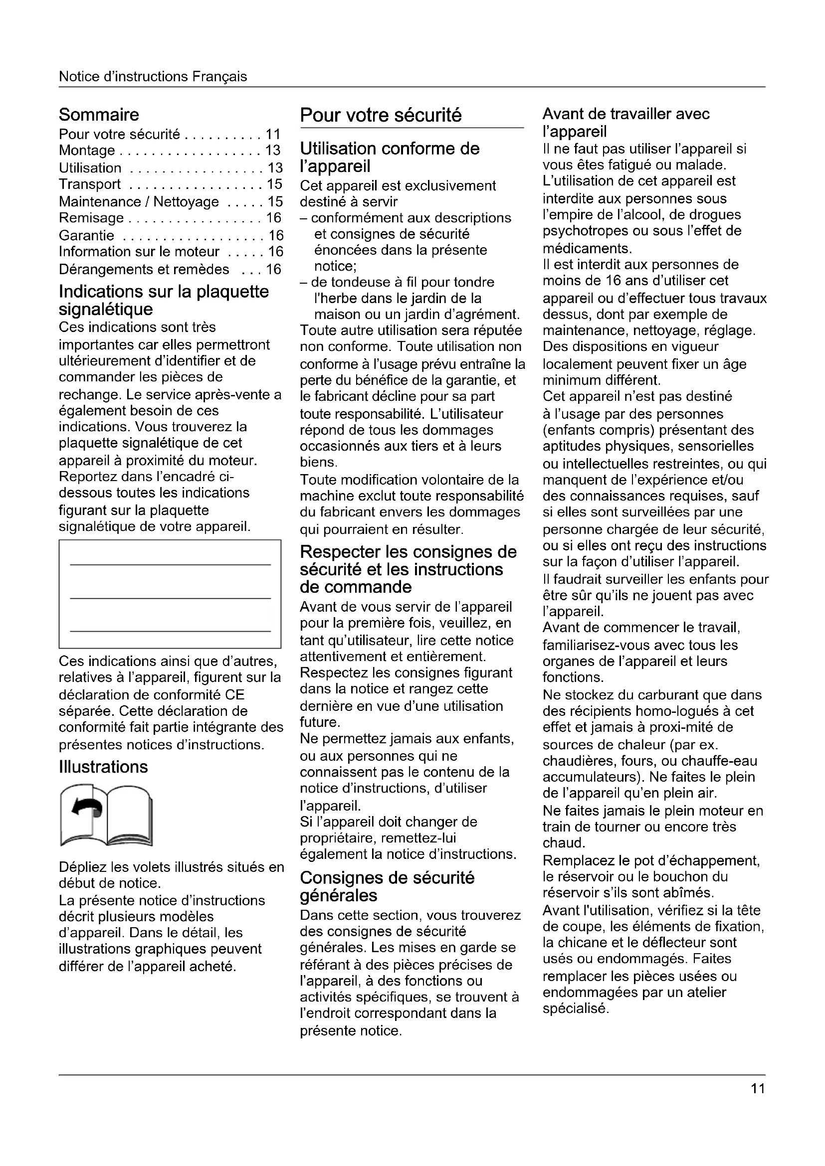 - Dérangements et remèdes Indications sur la plaquette signalétique Ces indications sont très importantes car elles permettront ultérieurement d’identifier et de commander les pièces de rechange. Le service après-vente a également besoin de ces indications. Vous trouverez la plaquette signalétique de cet appareil à proximité du moteur. Reportez dans l’encadré ci- dessous toutes les indications figurant sur la plaquette signalétique de votre appareil. Ces indications ainsi que d’autres, relatives à l’appareil, figurent sur la déclaration de conformité CE séparée. Cette déclaration de conformité fait partie intégrante des présentes notices d’instructions. Illustrations Dépliez les volets illustrés situés en début de notice. La présente notice d’instructions décrit plusieurs modèles d’appareil. Dans le détail, les illustrations graphiques peuvent différer de l’appareil acheté. Pour votre sécurité Utilisation conforme de l’appareil Cet appareil est exclusivement destiné à servir – conformément aux descriptions et consignes de sécurité énoncées dans la présente notice; – de tondeuse à fil pour tondre l'herbe dans le jardin de la maison ou un jardin d’agrément. Toute autre utilisation sera réputée non conforme. Toute utilisation non conforme à l’usage prévu entraîne la perte du bénéfice de la garantie, et le fabricant décline pour sa part toute responsabilité. L’utilisateur répond de tous les dommages occasionnés aux tiers et à leurs biens. Toute modification volontaire de la machine exclut toute responsabilité du fabricant envers les dommages qui pourraient en résulter. Respecter les consignes de sécurité et les instructions de commande Avant de vous servir de l’appareil pour la première fois, veuillez, en tant qu’utilisateur, lire cette notice attentivement et entièrement. Respectez les consignes figurant dans la notice et rangez cette dernière en vue d’une utilisation future. Ne permettez jamais aux enfants, ou aux personnes qui ne connaissent pas le contenu de la notice d’instructions, d’utiliser l’appareil. Si l’appareil doit changer de propriétaire, remettez-lui également la notice d’instructions. Consignes de sécurité générales Dans cette section, vous trouverez des consignes de sécurité générales. Les mises en garde se référant à des pièces précises de l’appareil, à des fonctions ou activités spécifiques, se trouvent à l’endroit correspondant dans la présente notice. Avant de travailler avec l’appareil Il ne faut pas utiliser l’appareil si vous êtes fatigué ou malade. L’utilisation de cet appareil est interdite aux personnes sous l’empire de l’alcool, de drogues psychotropes ou sous l’effet de médicaments. Il est interdit aux personnes de moins de 16 ans d’utiliser cet appareil ou d’effectuer tous travaux dessus, dont par exemple de maintenance, nettoyage, réglage. Des dispositions en vigueur localement peuvent fixer un âge minimum différent. Cet appareil n’est pas destiné à l’usage par des personnes (enfants compris) présentant des aptitudes physiques, sensorielles ou intellectuelles restreintes, ou qui manquent de l’expérience et/ou des connaissances requises, sauf si elles sont surveillées par une personne chargée de leur sécurité, ou si elles ont reçu des instructions sur la façon d’utiliser l’appareil. Il faudrait surveiller les enfants pour être sûr qu’ils ne jouent pas avec l’appareil. Avant de commencer le travail, familiarisez-vous avec tous les organes de l’appareil et leurs fonctions. Ne stockez du carburant que dans des récipients homo-logués à cet effet et jamais à proxi-mité de sources de chaleur (par ex. chaudières, fours, ou chauffe-eau accumulateurs). Ne faites le plein de l’appareil qu’en plein air. Ne faites jamais le plein moteur en train de tourner ou encore très chaud. Remplacez le pot d’échappement, le réservoir ou le bouchon du réservoir s’ils sont abîmés. Avant l'utilisation, vérifiez si la tête de coupe, les éléments de fixation, la chicane et le déflecteur sont usés ou endommagés. Faites remplacer les pièces usées ou endommagées par un atelier spécialisé.Français Notice d’instructions Les pièces de rechange et les accessoires doivent se conformer aux exigences définies par le fabricant. Pour ces raisons, n’utilisez que des pièces de rechange d’origine ou des pièces de rechange et accessoires homologués par le fabricantN'utilisez que les fils de coupe/dispositifs de coupe autorisés par le fabricant. Confiez les réparations exclusive-ment à un atelier spécialisé. Pendant les travaux avec l’appareil Pendant les travaux avec ou sur l’appareil, portez une tenue de travail appropriée telle que par exemple:– des chaussures de sécurité,– des vêtements moulants,– vêtements moulants,– protection anti-bruit,– lunettes enveloppantes.Tous les dispositifs de protection doivent toujours être fixés contre l’appareil et se trouver dans un état impeccable. N’apportez aucune modification aux équipements de sécurité.N’utilisez l’appareil que s’il est techniquement en parfait état.Ne modifiez jamais les préréglages du moteur effectués en usine.Eloignez toute flamme nue, ne provoquez pas d’étincelles et ne fumez pas. Avant d’effectuer tout travail sur l’appareil Pour vous protéger du risque de blessures, veuillez, avant d’effectuer tous travaux sur cet appareil (par ex. des travaux de maintenance et de réglage)– stoppez le moteur,– attendez que toutes les pièces mobiles se soient entièrement immobilisées et que le moteur ait refroidi,– sur le moteur, débranchez la cosse de la bougie pour empêcher un démarrage intempestif du moteur,– Lire les consignes de sécurité supplémentaires figurant dans le manuel du moteur. Après les travaux avec l’appareil Ne vous éloignez jamais de l'appa-reil 