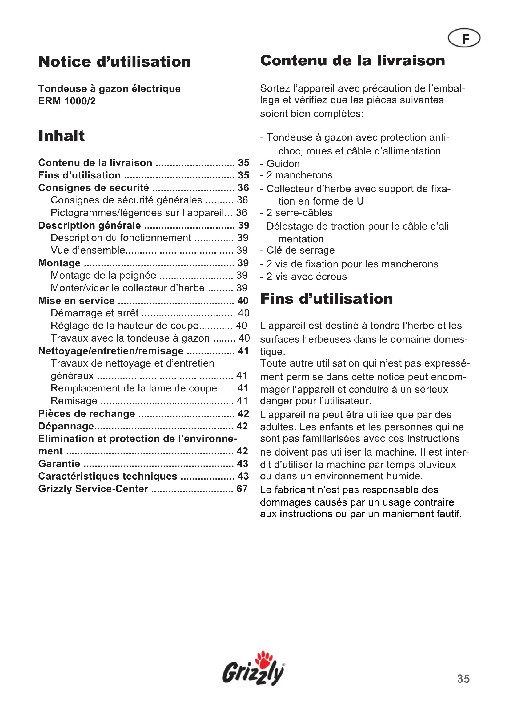 ERM 10002 - Tondeuse à gazon Grizzly - Notice d'utilisation et mode d'emploi gratuit