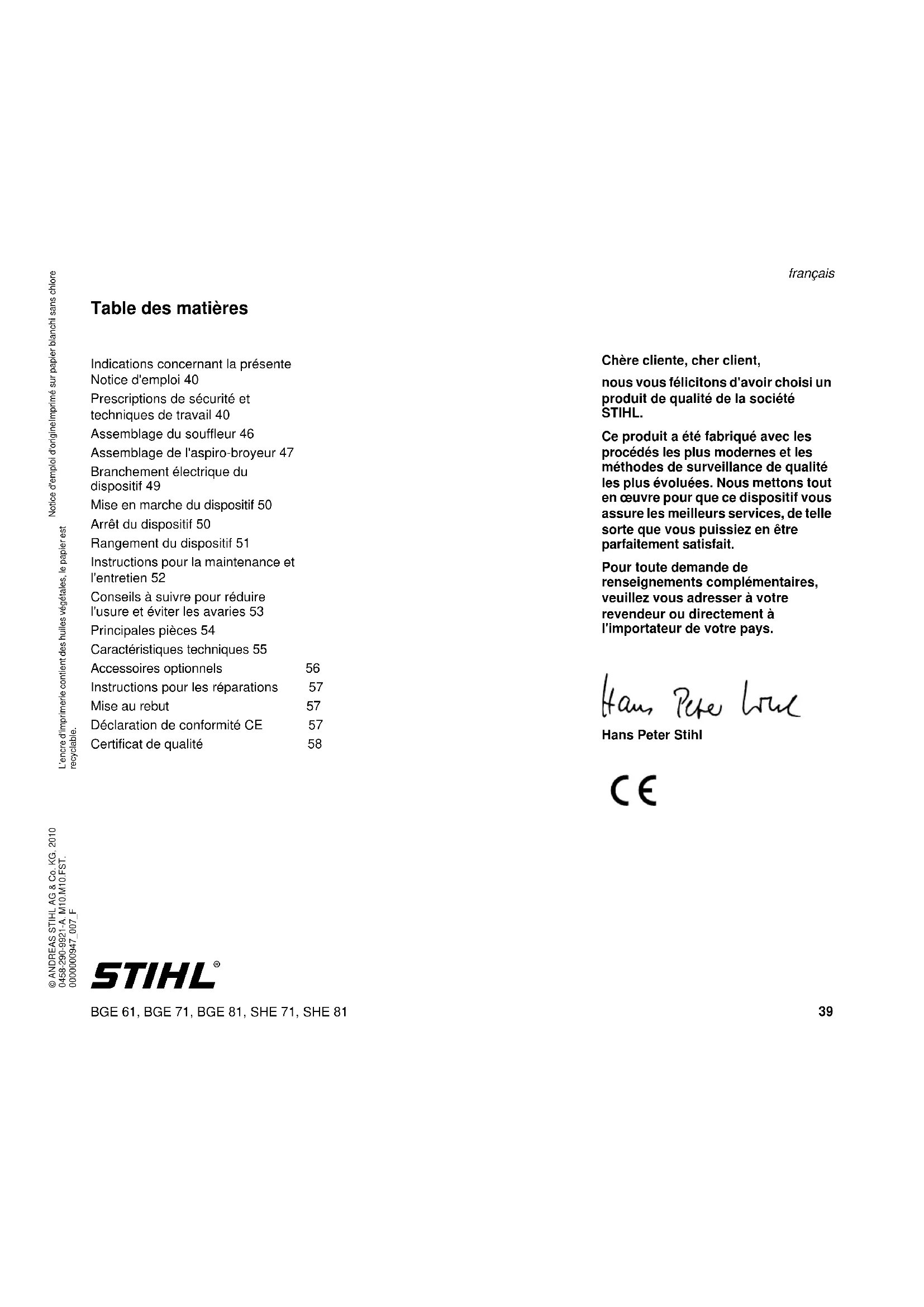 Table des matières Chère cliente, cher client, nous vous félicitons d'avoir choisi un produit de qualité de la société STIHL. Ce produit a été fabriqué avec les procédés les plus modernes et les méthodes de surveillance de qualité les plus évoluées. Nous mettons tout en œuvre pour que ce dispositif vous assure les meilleurs services, de telle sorte que vous puissiez en être parfaitement satisfait. Pour toute demande de renseignements complémentaires, veuillez vous adresser à votre revendeur ou directement à l'importateur de votre pays. Hans Peter Stihl Indications concernant la présente Notice d'emploi 40 Prescriptions de sécurité et techniques de travail 40 Assemblage du souffleur 46 Assemblage de l'aspiro-broyeur 47 Branchement électrique du dispositif 49 Mise en marche du dispositif 50 Arrêt du dispositif 50 Rangement du dispositif 51 Instructions pour la maintenance et l'entretien 52 Conseils à suivre pour réduire l'usure et éviter les avaries 53 Principales pièces 54 Caractéristiques techniques 55 Accessoires optionnels 56 Instructions pour les réparations 57 Mise au rebut 57 Déclaration de conformité CE 57 Certificat de qualité 58BGE 61, BGE 71, BGE 81, SHE 71, SHE 81 français