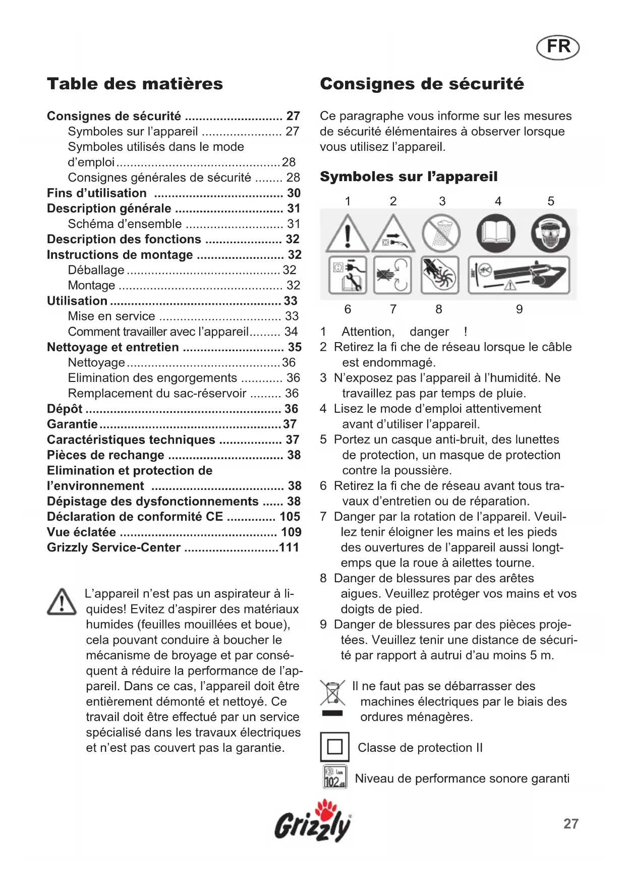 L'appareil n'est pas un aspirateur à liquides! Evitez d'aspirer des matériaux humides (feuilles mouillées et boue), cela pouvant conduire à boucher le mécanisme de broyage et par conséquent à réduire la performance de l'appareil. Dans ce cas, l'appareil doit être entièrement démonté et nettoyé. Ce travail doit être effectué par un service spécialisé dans les travaux électriques et n'est pas couvert pas la garantie.