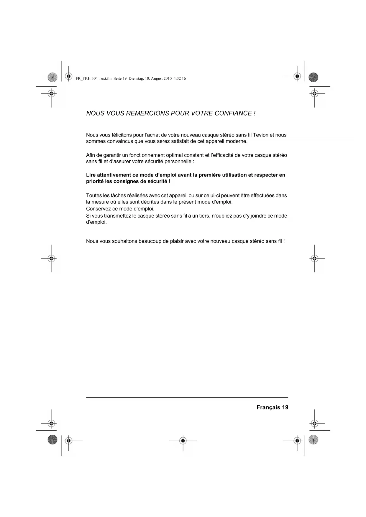 FKH 304 Hofer.book Seite 18 Montag, 9. August 2010 2:23 14Français 19 NOUS VOUS REMERCIONS POUR VOTRE CONFIANCE ! Nous vous félicitons pour l’achat de votre nouveau casque stéréo sans fil Tevion et nous sommes convaincus que vous serez satisfait de cet appareil moderne. Afin de garantir un fonctionnement optimal constant et l’efficacité de votre casque stéréo sans fil et d’assurer votre sécurité personnelle : Lire attentivement ce mode d’emploi avant la première utilisation et respecter en priorité les consignes de sécurité ! Toutes les tâches réalisées avec cet appareil ou sur celui-ci peuvent être effectuées dans la mesure où elles sont décrites dans le présent mode d’emploi. Conservez ce mode d’emploi. Si vous transmettez le casque stéréo sans fil à un tiers, n’oubliez pas d’y joindre ce mode d’emploi. Nous vous souhaitons beaucoup de plaisir avec votre nouveau casque stéréo sans fil ! FR_FKH 304 Text.fm Seite 19 Dienstag, 10. August 2010 4:32 1620 Français