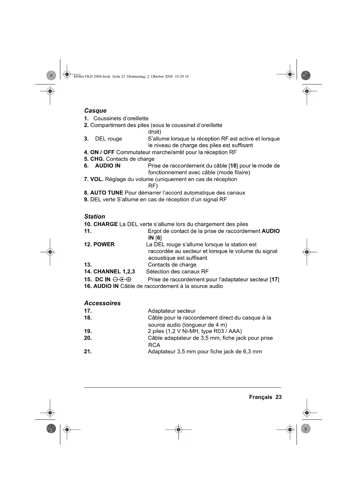 HOfer FKH 2008.book Seite 20 Donnerstag, 2. Oktober 2008 10:29 10Français 21 NOUS VOUS REMERCIONS POUR VOTRE CONFIANCE ! Nous vous félicitons pour l’achat de votre nouveau casque sans fil Tevion et nous sommes convaincus que vous serez satisfait de cet appareil moderne. Afin de garantir un fonctionnement optimal constant et l’efficacité de votre casque sans fil et d’assurer votre sécurité personnelle, nous vous demandons de : Lire attentivement ce mode d’emploi avant la première utilisation et respecter en priorité les consignes de sécurité ! Toutes les tâches réalisées avec cet appareil ou sur celui-ci peuvent être effectuées dans la mesure où elles sont décrites dans le présent mode d’emploi. Conservez ce mode d’emploi. Si vous transmettez ce casque sans fil, n’oubliez pas d’y joindre ce mode d’emploi. Nous vous souhaitons beaucoup de plaisir avec votre nouveau casque sans fil ! HOfer FKH 2008.book Seite 21 Donnerstag, 2. Oktober 2008 10:29 1022 Français
