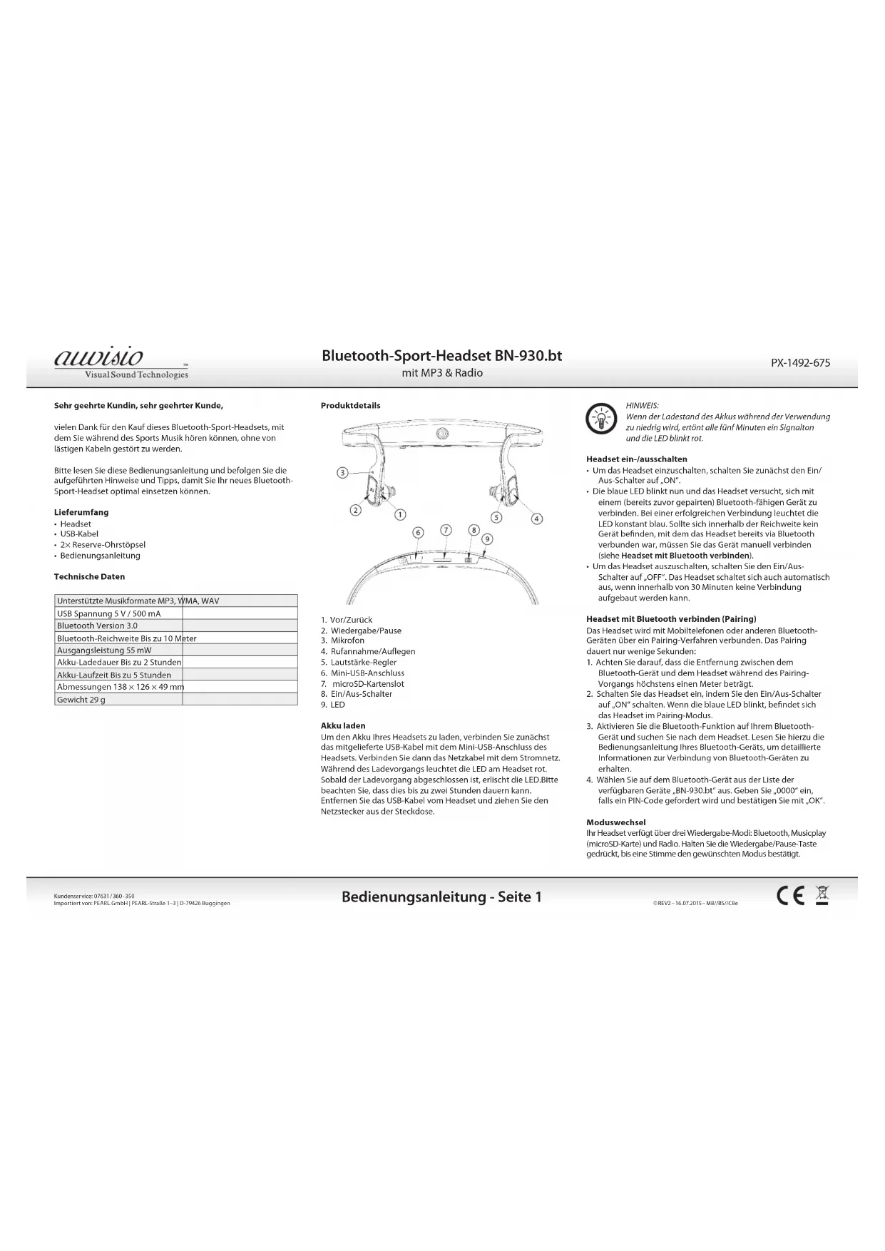 Micro-casque Bluetooth® sport "BN-930.bt" avec MP3 & radio PX-1492-675 Mode d'emploi - page 2 © REV2 – 16.07.2015 – MB//BS//CBe Service commercial : 0033 ( 0 ) 3 88 58 02 02 Importé par Pearl | 6 rue de la Scheer | F-67600 Sélestat