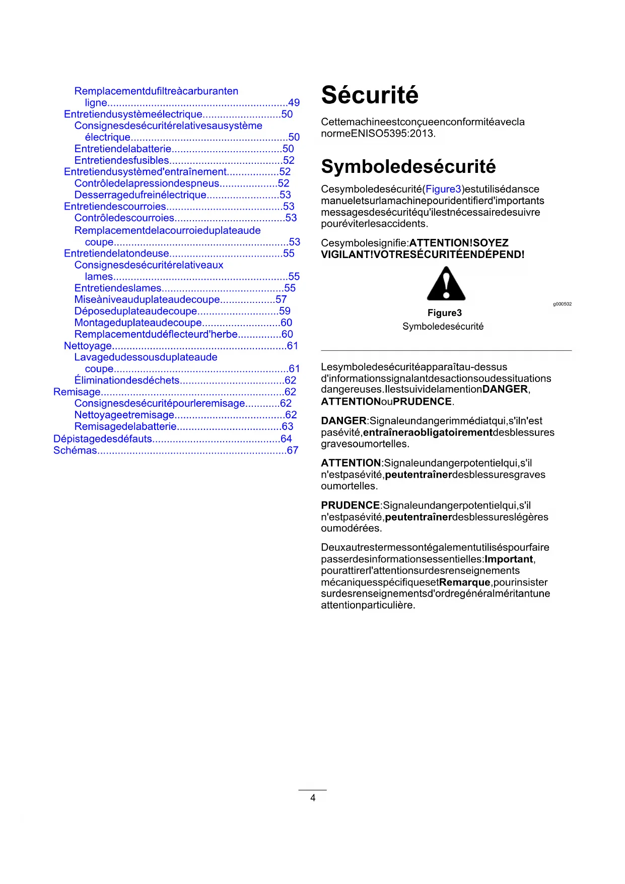 - Schémas Sécurité Cettemachineestconçueenconformitéavecla normeENISO5395:2013. Symboledesécurité Cesymboledesécurité(Figure3)estutilisédansce manueletsurlamachinepouridentierd'importants messagesdesécuritéqu'ilestnécessairedesuivre pouréviterlesaccidents. Cesymbolesignie:ATTENTION!SOYEZ VIGILANT!VOTRESÉCURITÉENDÉPEND! g000502 Figure3 Symboledesécurité Lesymboledesécuritéapparaîtau-dessus d'informationssignalantdesactionsoudessituations dangereuses.IlestsuividelamentionDANGER, ATTENTIONouPRUDENCE. p. 67