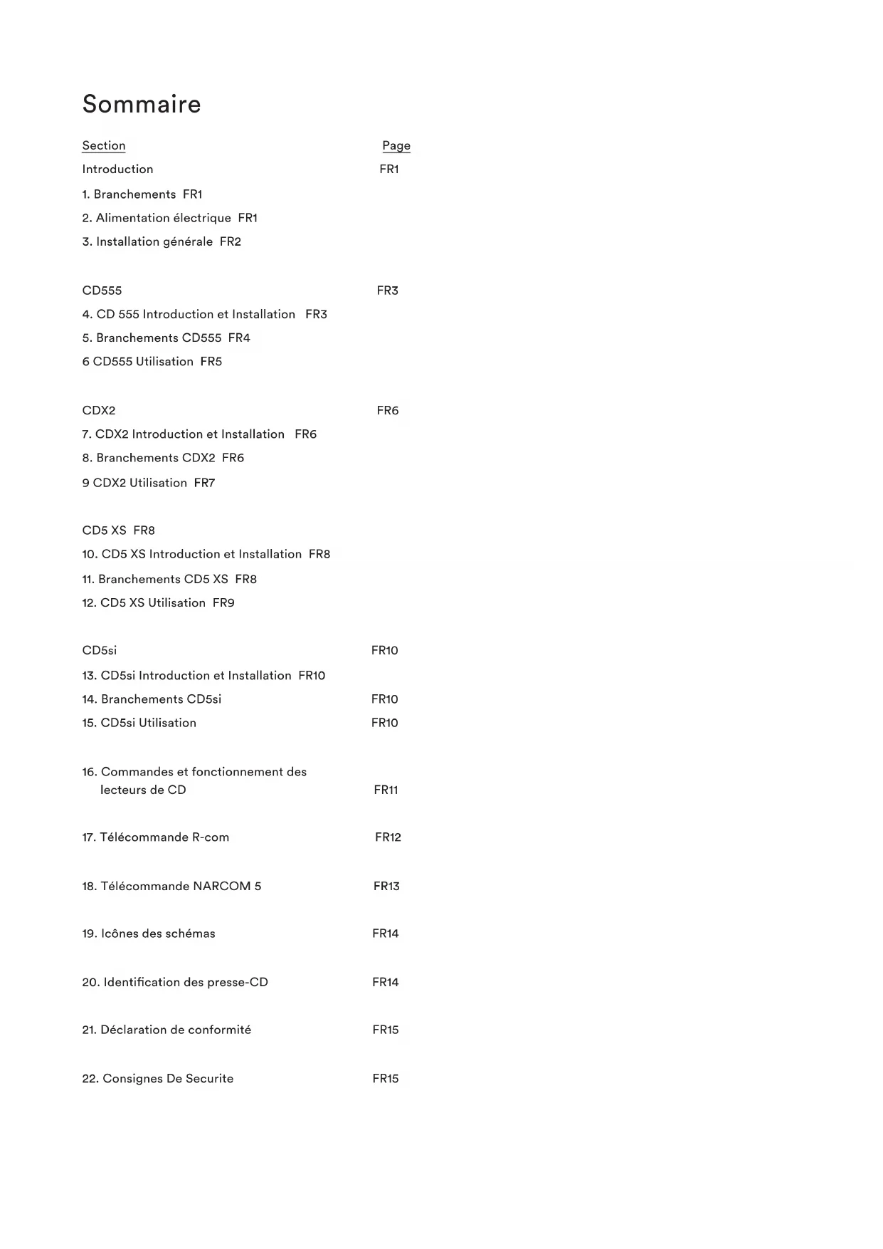 Section PageFR1 Introduction La conception des produits Naim Audio vise en premier lieu les performances. Une installation minutieuse est nécessaire pour assurer la réalisation de tout leur potentiel. Ce manuel couvre les lecteurs de CD suivants : CD 555, CDX2, CD5 XS et CD5si, ainsi que leurs alimentations électriques associées ou de mise à niveau. Le manuel commence par des informations géné- rales concernant l’installation et les avertissements réglementaires sur la sécurité. Les informa- tions spéciques aux diérents produits commencent en Section 4.
