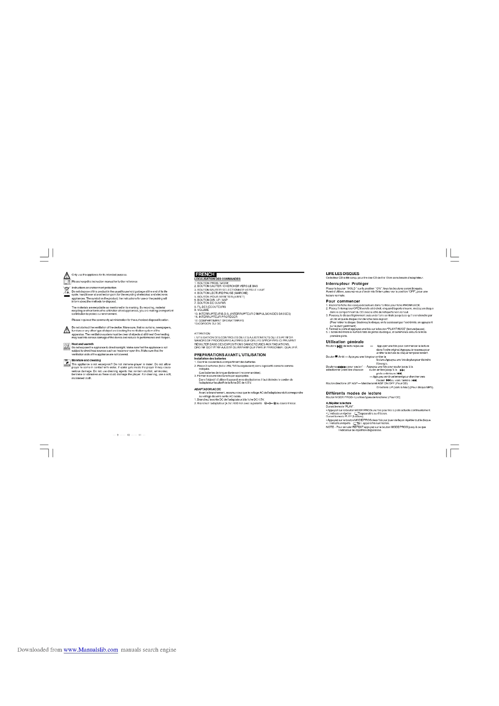 Quand l’indicateur de batteries apparaît sur l’écran, veuillez préparer à remplacer par des batteries nouvelles. MAINTENANCE Pour nettoyer les verres Si la lentille devient poussiéreuse, nettoyez-la à l’aide d’un souffleur de verres d’appareil photo. Attention à ne pas railler la surface de la lentille. Pour nettoyer le cabinet De temps en temps, nettoyez le cabinet à l’aide d’un tissu doux et sec. Pour des taches plus résistantes, humidifiez légèrement le tissu avec un peu d’eau ou avec une solution douce de détergeant. N’utilisez jamais de benzine, alcool ou d’autres dissolvants car ils pourraient endommager la finition du cabinet. SPÉCIFICATIONS Sorite d’énergie : 20mW (32 ) Réponse de fréquence : 100 ~ 20000 Hz Source d’énergie : batteries de taille 2 xUM-3 ou “ AA “ Adaptateur AC-DC 4.5V (600mA) Dimensions : 146mm (Largeur) x146mm (Profondeur) x27mm (Hauteur) ** Dans une optique d’amélioration, les spécifications et le design sont sujets à des changements sans avertissement. ** GUIDE DE RÉPARATION DE PROBLÈMES Pour nettoyer le disc Quand un disque devient sale, nettoyez-le à l’aide d’un tissu de nettoyage. Nettoyez le disque du centre vers l’extérieur. Note - N’utilisez pas de dissolvant comme de la benzine, diluants, produits de nettoyage disponibles dans le commerce ou sprays antistatiques prévus pour des disques analogues. ** Si vous avez des difficultés dans l’utilisation de ce lecteur, veuillez vous référer au tableau suivant avant de contacter votre détaillant ou l’endroit de l’achat. Guide de solution aux problèmes Problèmes Points à vérifier Le lecteur ne fonctionne pas • Le disque doit être inséré vers le bas.