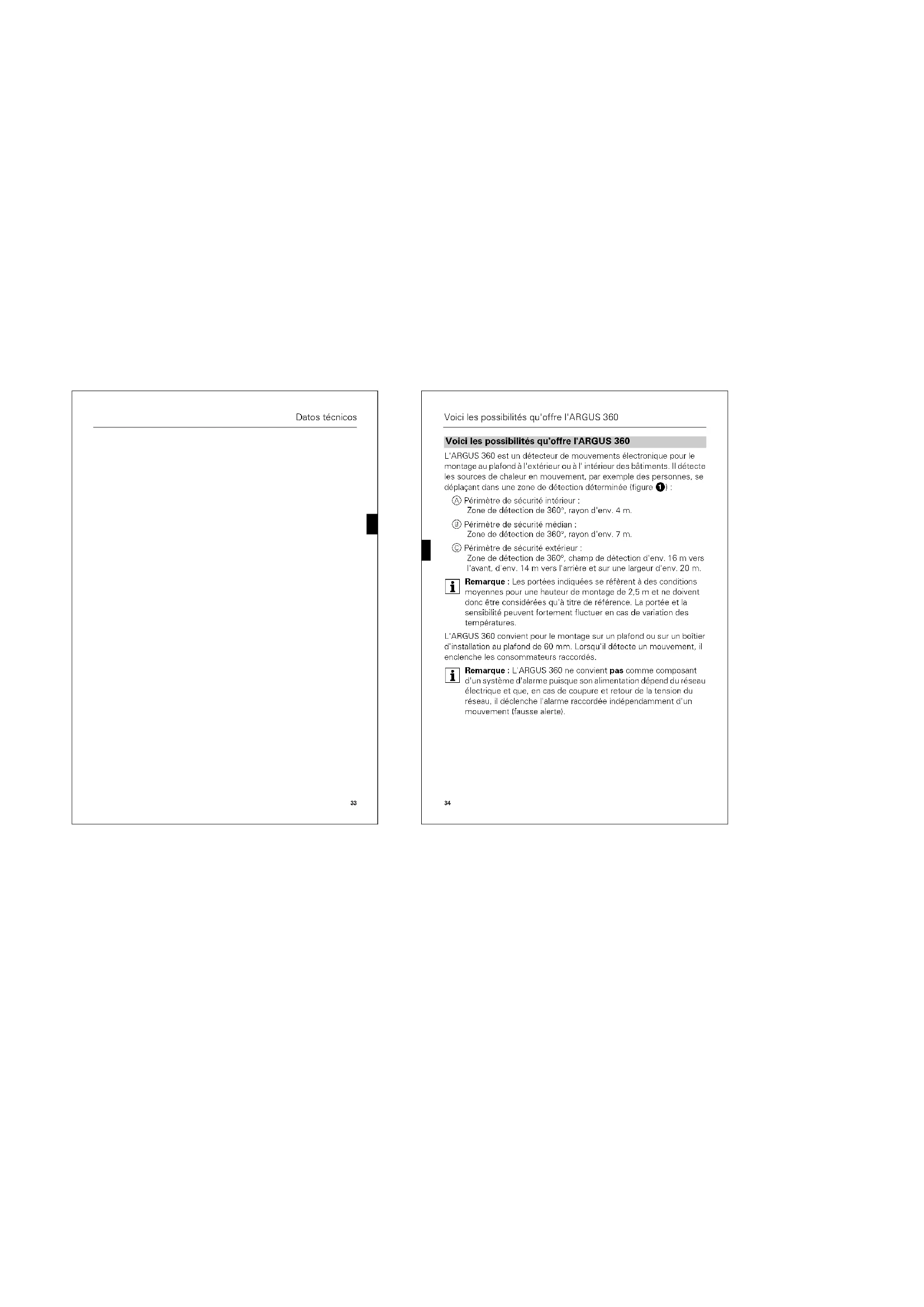 L'ARGUS 360 est un détecteur de mouvements électronique pour le montage au plafond à l'extérieur ou à l'intérieur des bâtiments. Il détecte les sources de chaleur en mouvement, par exemple des personnes, se déplaçant dans une zone de détection déterminée (figure ①):