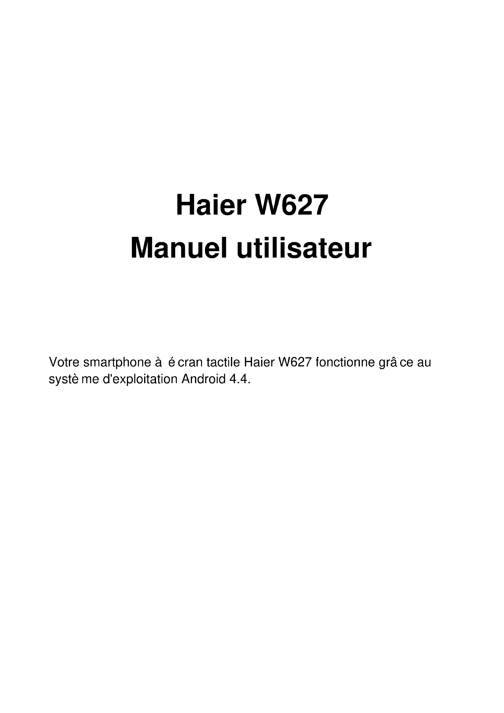 Votre smartphone à écran tactile Haier W627 fonctionne grâce au système d'exploitation Android 4.4.-2- INTRODUCTION Nous vous remercions de la confiance que vous nous témoignez en choisissant le Smartphone Haier W627. Ce Smartphone Android est équipé d'un processeur dual core cadencé à 1,2 GHz et fonctionne sous le système d'exploitation Android v4.4. Si vous souhaitez conserver votre téléphone en parfait état de fonctionnement le plus longtemps possible, lisez attentivement ce manuel utilisateur et conservez-le pour consultation ultérieure. Vous pourriez en avoir besoin à tout moment. Les illustrations présentées dans ce manuel peuvent ne pas être la réplique exacte de ce que vous voyez à l'écran. Notre but étant de décrire les fonctions principales de votre téléphone. Les informations sur la mémoire : - Mémoire totale : 4 Go ; - Mémoire utilisée par le système d’exploitation et les applications intégrées : 2.2 Go. - Mémoire disponible : 1.8 Go.