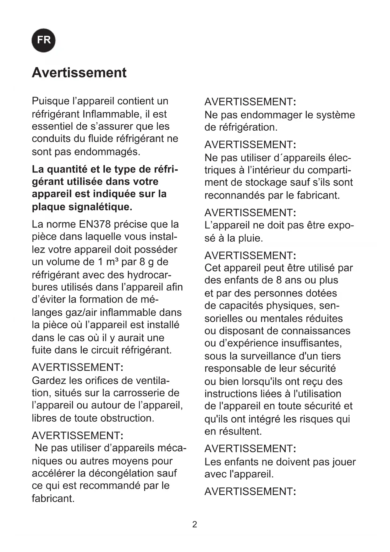 Puisque l’appareil contient un réfrigérant Inammable, il est essentiel de s’assurer que les conduits du uide réfrigérant ne sont pas endommagés. La quantité et le type de réfri- gérant utilisée dans votre appareil est indiquée sur la plaque signalétique. La norme EN378 précise que la pièce dans laquelle vous instal- lez votre appareil doit posséder un volume de 1 m³ par 8 g de réfrigérant avec des hydrocar- bures utilisés dans l’appareil an d’éviter la formation de mé- langes gaz/air inammable dans la pièce où l’appareil est installé dans le cas où il y aurait une fuite dans le circuit réfrigérant.