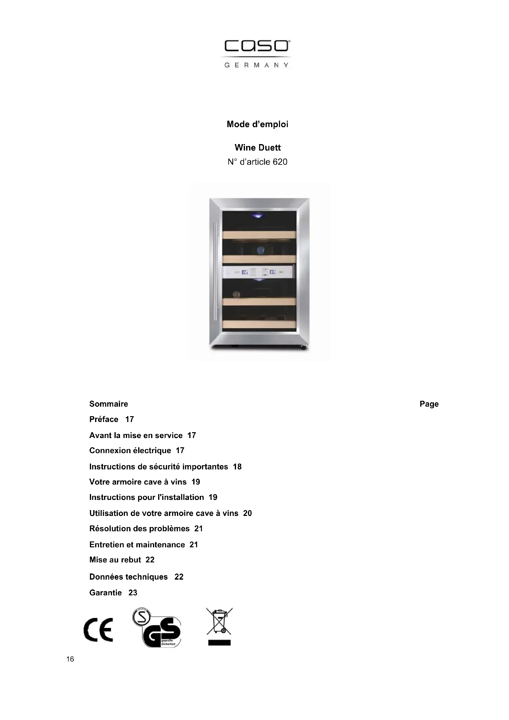 Retrouvez gratuitement la notice de l'appareil Wine Duett 620 CASO au format PDF.
