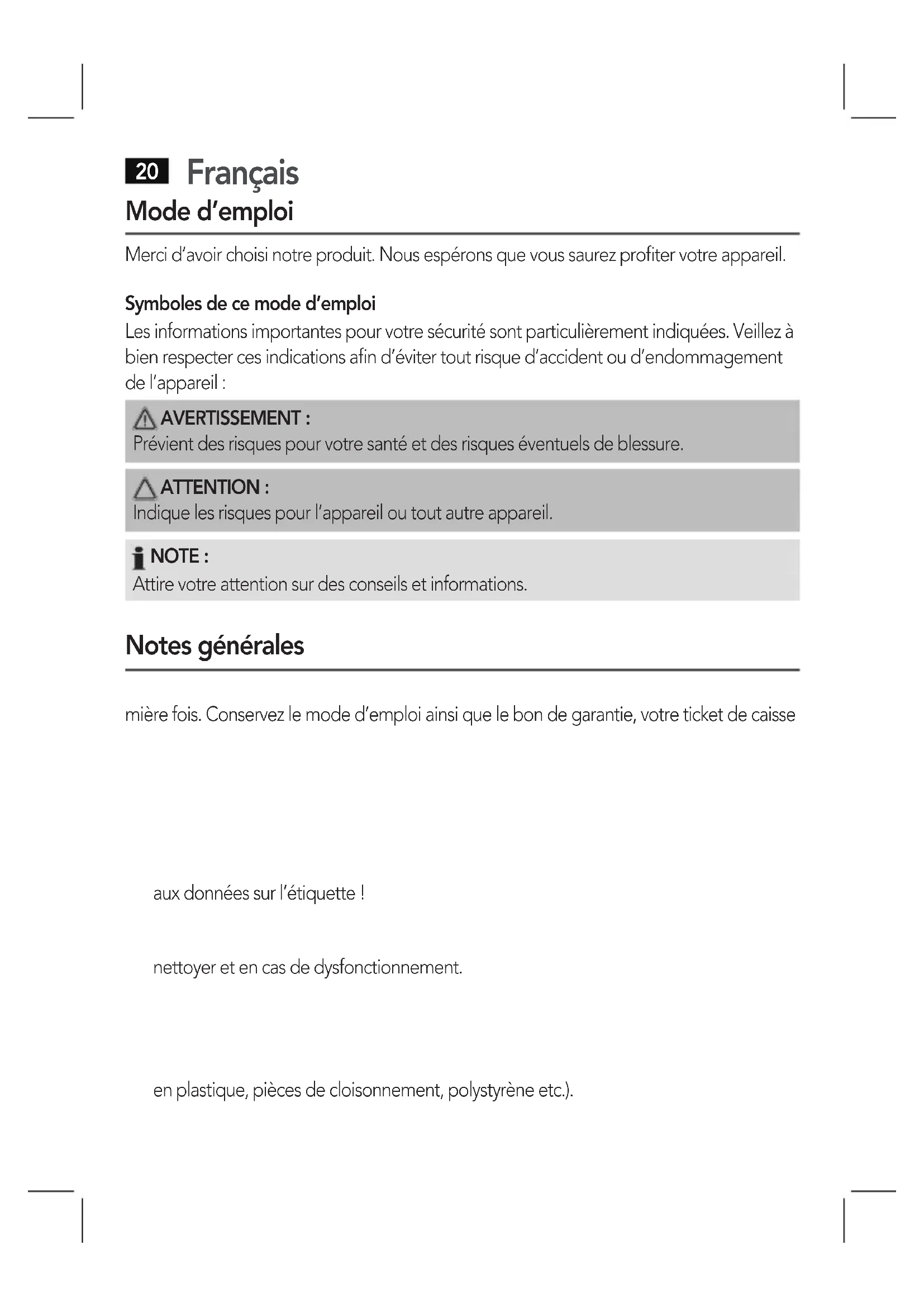 mière fois. Conservez le mode d'emploi ainsi que le bon de garantie, votre ticket de caisse