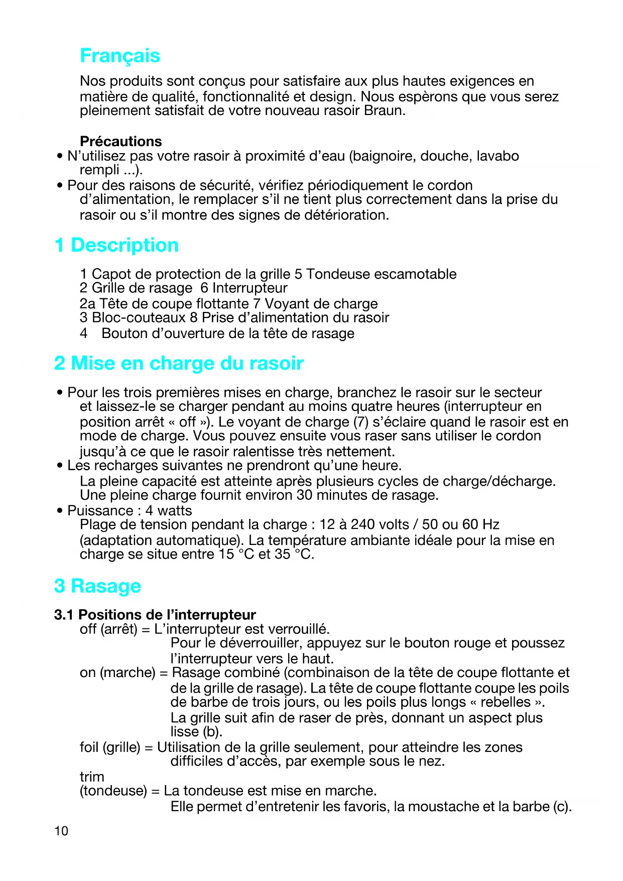 Nos produits sont conçus pour satisfaire aux plus hautes exigences en matière de qualité, fonctionnalité et design. Nous espèrons que vous serez pleinement satisfait de votre nouveau rasoir Braun. Précautions