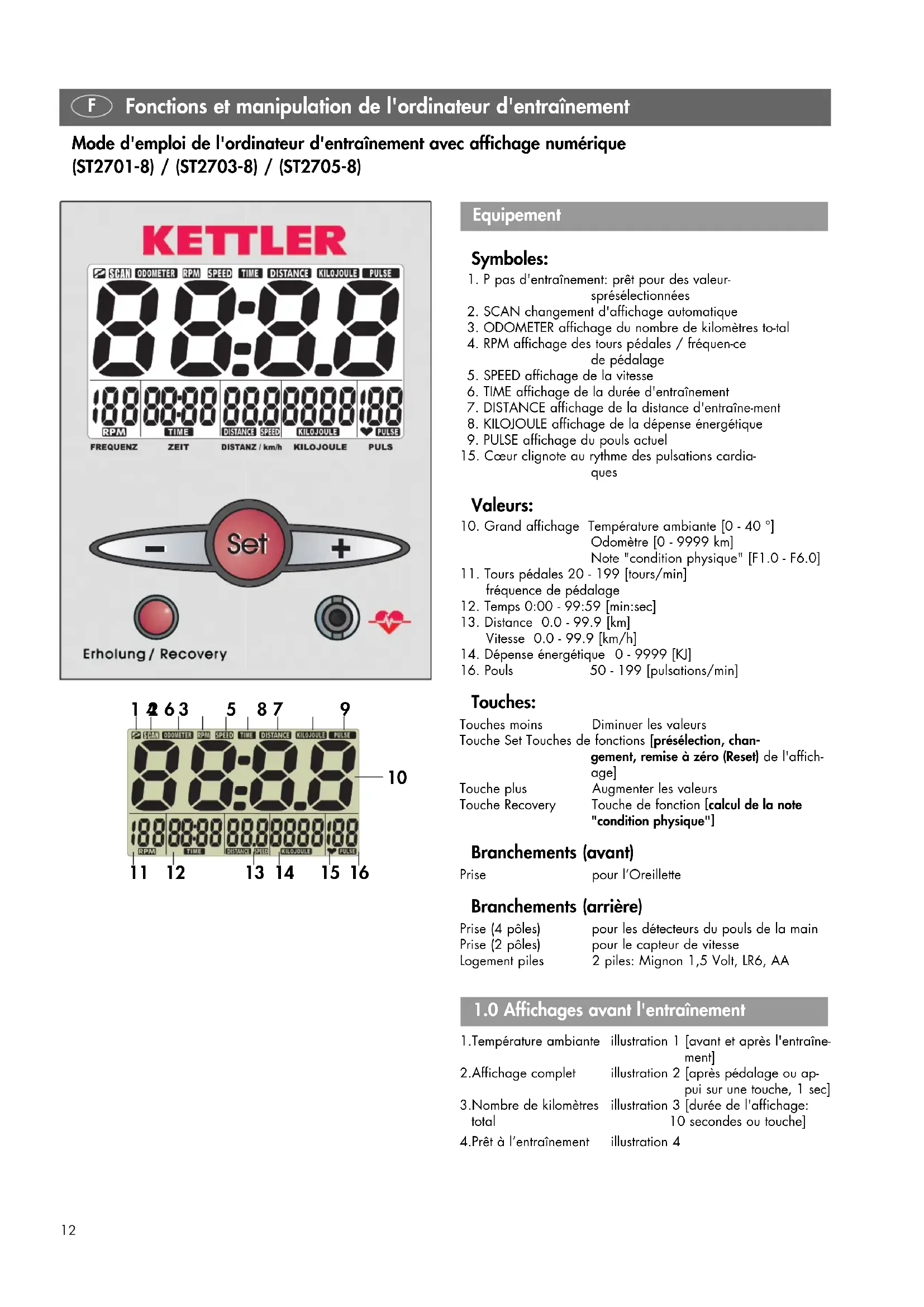 Touches: Touches moins Diminuer les valeurs Touche Set Touches de fonctions [présélection, chan- gement, remise à zéro (Reset) de l'affich- age] Touche plus Augmenter les valeurs Touche Recovery Touche de fonction [calcul de la note "condition physique"] Branchements (avant) Prise pour l’Oreillette Branchements (arrière) Prise (4 pôles) pour les détecteurs du pouls de la main Prise (2 pôles) pour le capteur de vitesse Logement piles 2 piles: Mignon 1,5 Volt, LR6, AA 1.Température ambiante illustration 1 [avant et après l'entraîne- ment] 2.Affichage complet illustration 2 [après pédalage ou ap- pui sur une touche, 1 sec] 3.Nombre de kilomètres illustration 3 [durée de l'affichage: total 10 secondes ou touche] 4.Prêt à l’entraînement illustration 4