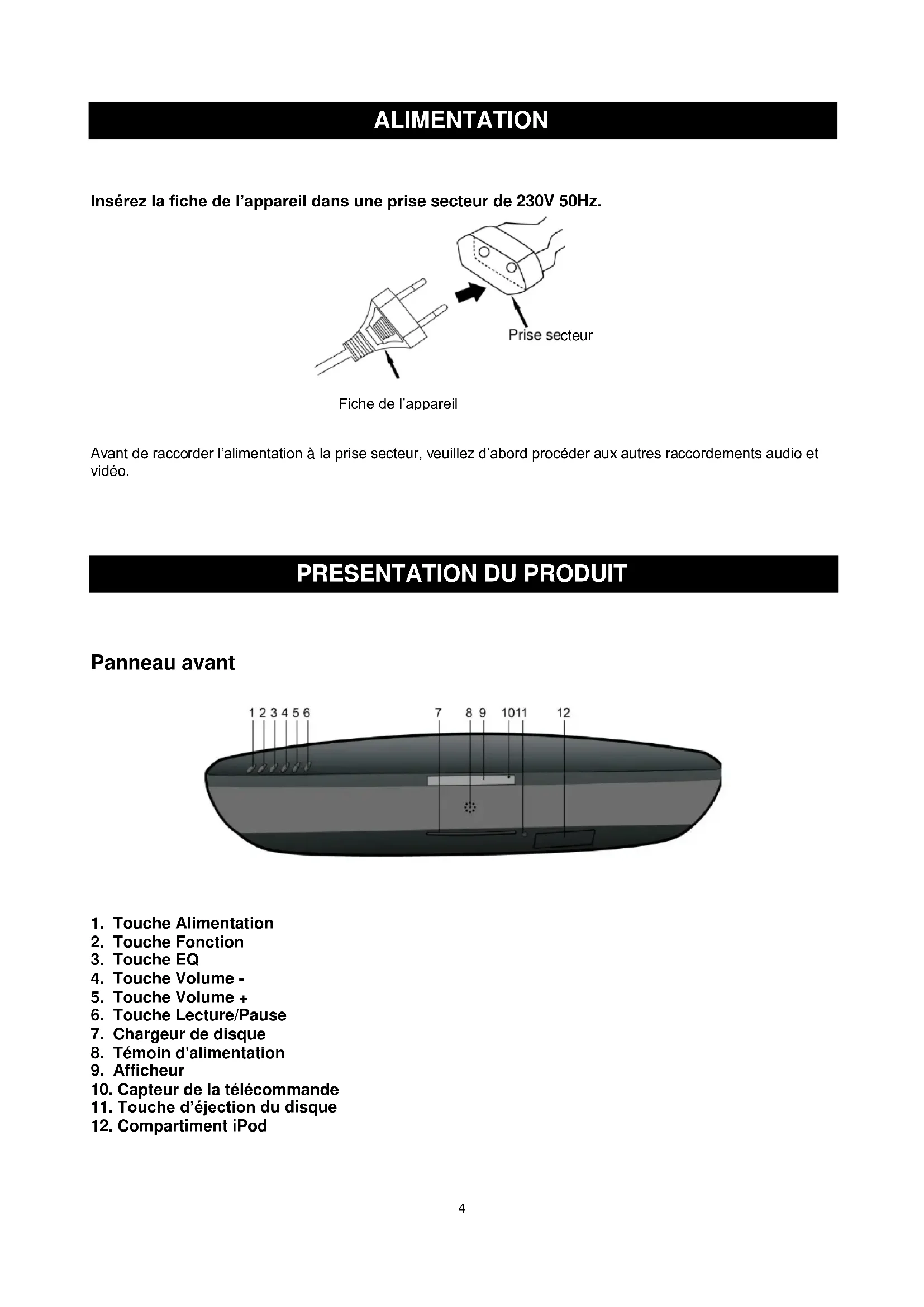 ATTENTION ! Appareil sous tension dangereuse ! Ne pas ouvrir. Risque de choc électrique ! Aucune pièce n’est susceptible d’être réparée par l’utilisateur. Laissez à des personnes qualifiées le soin d’assurer l’entretien de votre appareil. Si le câble d’alimentation est endommagé, il doit être remplacé par le fabricant, son service après –vente ou des personnes de qualification similaire afin d’éviter un danger. Le produit doit être installé en accord avec les réglementations nationales. Les piles ou batteries usagées doivent être mises au rebut de façon sûre. Les déposer dans des bacs de collecte prévus (renseignez-vous auprès de votre revendeur) afin de protéger l'environnement. Bonne disposition de l’appareil - Placez l’appareil sur une surface plane, rigide et stable. Ne pas placer l’appareil sur un tapis. - Ne posez pas votre appareil au-dessus d’un autre dispositif qui risquerait d’entraîner une surchauffe (par exemple, un récepteur ou un amplificateur). - Ne placez rien en dessous de l’appareil (par exemple, des CD ou des magazines). Espace de ventilation - Placez l’appareil dans un endroit suffisamment ventilé afin d’éviter une accumulation de chaleur interne. Laissez au moins un espace de 10cm à l’arrière et au-dessus de l’appareil ainsi qu’un espace de 5cm sur les côtés afin d’éviter toute surchauffe. - Ne pas obstruer les ouvertures de ventilation par des objets tels que des journaux, nappes, rideau, etc… Préservez l’appareil des températures élevées, de l’humidité, de l’eau et de la poussière. - L’appareil ne doit pas être exposé à des égouttements d’eau ou des éclaboussures. Aucun objet rempli de liquide tel que des vases ne doit être placé sur l’appareil. - Ne placez pas d’objets susceptibles d’endommager votre appareil près de ce dernier (par exemple, objets remplis de liquide ou bougies allumées). - Ne pas placer sur l'appareil de sources de flammes nues telles que des bougies allumées. Alimentation électrique - Veuillez débrancher le produit en cas de non-utilisation prolongée. - Cet appareil est destiné à être utilisé sous un climat tempéré. Cet appareil ne doit pas être utilisé sous un climat tropical. - Si le cordon d’alimentation est endommagé, celui-ci doit être remplacé par le fabricant, son service après- vente ou des personnes qualification similaire afin d’éviter un danger. - Cet appareil doit être relié à un réseau électrique 230V ~ 50Hz. - La prise du réseau d’alimentation doit demeurer aisément accessible après l’installation du produit.