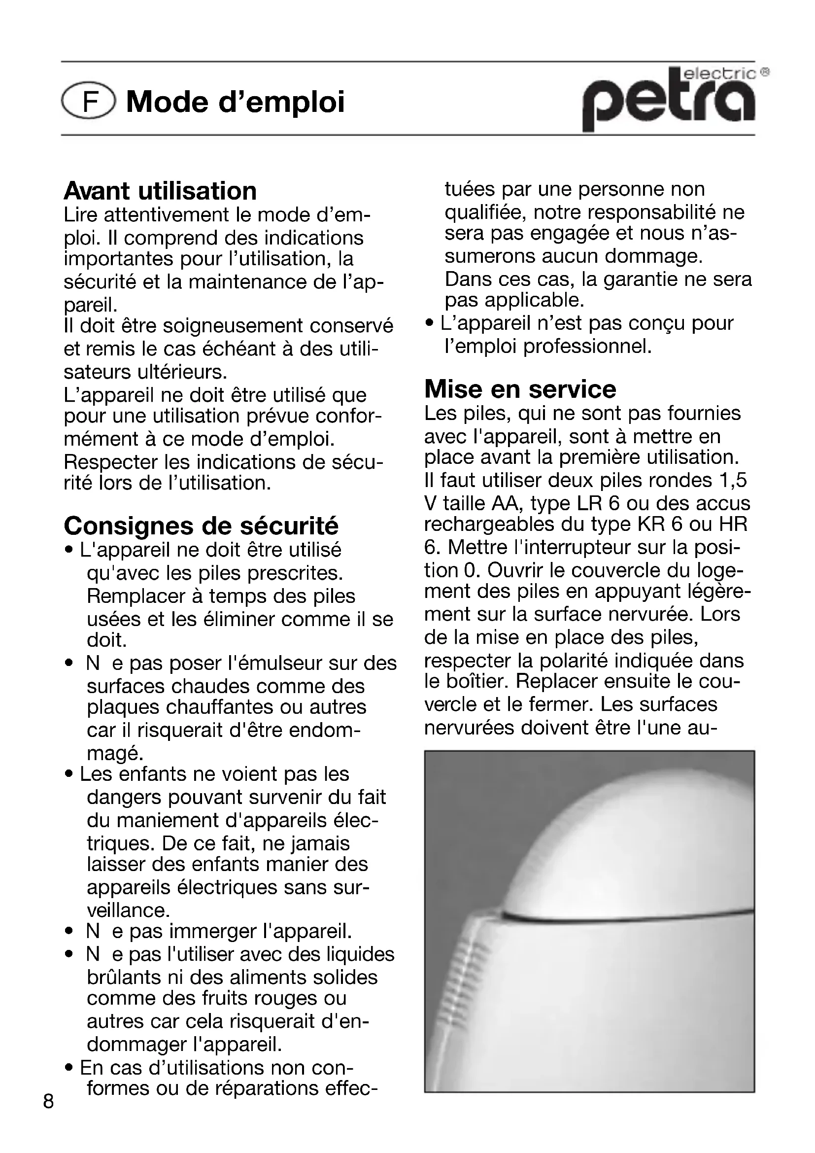 dessus de l'autre. Si le nombre de tours diminue net- tement, les piles sont vides et doi- vent être remplacées. Si l'émulseur n'est pas utilisé pendant une pério- de prolongée, il faut retirer les piles de l'appareil. Utilisation L'appareil est destiné à émulsion- ner de faibles quantités de liquide. La puissance de l'appareil ne suffit pas pour traiter des aliments visqueux ni des quantités plus importantes. Bien nettoyer l'appareil avant la première utilisation. Pour éviter toute éclaboussure pendant le traitement, ne mettre le moteur en marche que si batteur avec ressort amovible se trouve dans le liquide. Le mieux est donc d'utiliser un récipient à bord haut comme p.ex. un verre à boire. Le liquide se met à tourner dans le récipient, avec le batteur avec res- sort amovible, peu après la mise en service. Il convient d'empêcher cela en faisant tourner l'émulseur dans le sens opposé. Dès que la mousse se forme, relever l'appareil afin que le batteur fonctionne juste au-dessous de la surface. Émulsionner du lait En principe, n'importe quel lait convient. Toutefois, sa fraîcheur et son taux de pasteurisation peuvent avoir une influence sur le résultat. En général, on obtient une meilleu- re mousse avec du lait allégé en matières grasses. Remplir un verre au 1/4 maximum. Après avoir émulsionné le lait, le laisser reposer 1 à 2 minutes. La mousse atteint ainsi une fermeté optimale. Lorsque la mousse s'est résorbée, on peut de nouveau émulser le lait restant. Préparation de cocktails Remplir le verre au 2/3 au maxi- mum pour éviter tout risque de débordement. Ne pas utiliser d'in- grédients solides comme des fruits rouges ou autres. Fouetter de la crème fraîche Fouetter au maximum 100 ml de crème bien réfrigérée en procédant comme pour la mousse du lait.Préparation de sauces de salades Les ingrédients peuvent être mélangés sans problème dans un verre. Battre des blancs d'œufs Mettre au maximum deux blancs d'œufs dans un récipient. En les battant, veiller à ce que le batteur avec ressort amovible ne travaille que seulement juste sous la surfa- ce. S'il est plongé trop profondé- ment, le nombre de tours diminue trop fortement et vous n'obtenez pas le résultat désiré. Nettoyage et entretien Il est recommandé de nettoyer l'ap- pareil immédiatement après cha- que utilisation. Le mieux est de plonger batteur avec ressort amovi- ble dans un verre rempli d'eau pour la vaisselle et de le mettre en mar- che. Pour un nettoyage plus efficace du batteur, on peut démonter le res- sort avec précaution. Essuyer l'extérieur de l'appareil seulement avec un chiffon humide. Après le nettoyage, ranger l'émul- seur sur le support. En cas de ran- gement couché, veiller à ce que le batteur avec ressort amovible ne puisse pas se déformer. Cet appareil est conforme à la directive CE no. 89 / 336 EWG. Sous réserve de changements techniques. Propre élimination des emballages.