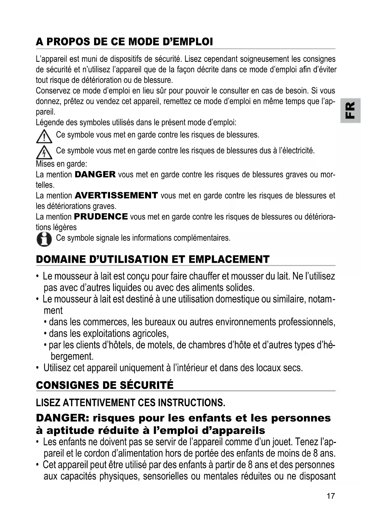 - Le mousseur à lait est conçu pour faire chauffer et mousser du lait. Ne l'utilisez pas avec d'autres liquides ou avec des aliments solides.