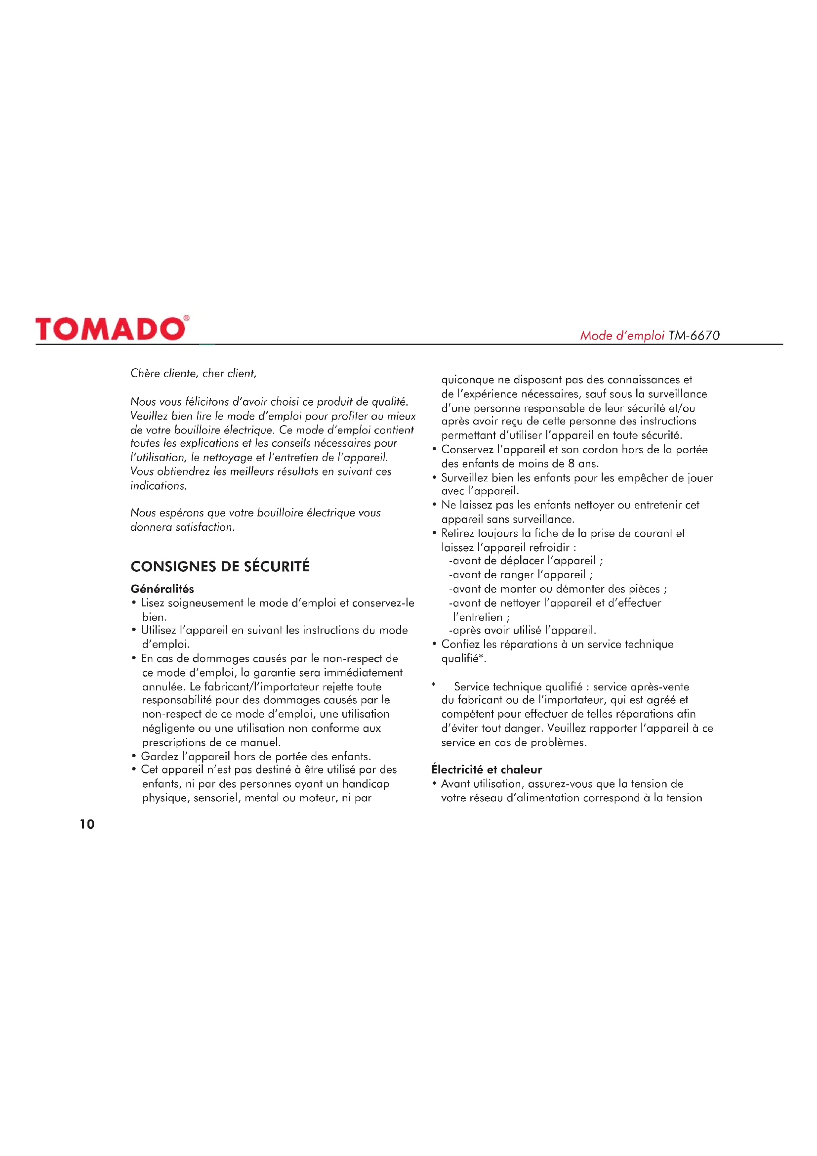 TM6670 - Bouilloire Tomado - Notice d'utilisation et mode d'emploi gratuit