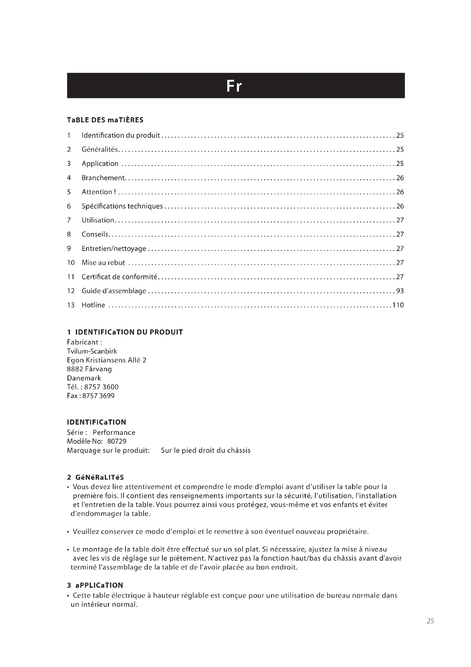- Latableestfabriquéeenmatériauxpouvantêtrerecyclés.Lamiseaurebutdoitsefaireselonles règlements locaux pour l’élimination des déchets. 11 CERTIFICaT DE CONFORmITé CERTIFICaT DE CONFORmITé - CE Fabricant : Tvilum-Scanbirk Egon Kristiansens Allé 2 8882 Fårvang Danemark Tél. +45 8757 3600 DéCLaRE CI-aPRÈS qUE LE PRODUIT SUIvaNT Série : Performance Modèle no : 80729 Avec plans de travail modèles no : 80702, 80703, 80706, 80707 ou 80708 Type : Bureau Annéedemarquage: 2008 EST CONFORmE SELON : laDirectiveeuropéenneduParlementetduConseil,du15décembre2004,concernantlerapprochement deslégislationsdesÉtatsmembresrelativesàlacompatibilitéélectromagnétique(2004/108/CE) laDirectiveeuropéenneduParlementetduConseil,du12décembre2006,concernantlerapprochement deslégislationsdesÉtatsmembresrelativesaumatérielélectriquedestinéàêtreutilisédanscertaineslimites detension(2006/95/CE). LaDirectiveeuropéenneduParlementetduConseil,du22juin1998,concernantlerapprochementdes législationsdesÉtatsmembresrelativesauxmachines(98/37/CE).28 etfabriquéselonlesnormesnationalessuivantes,visantuneharmonisationdelalégislationsurles machines : DS/EN 527-1:2000 Meubles de bureaux. Tables et bureaux. - Paragraphe 1 : Dimensions. DS/EN 527-2:2002 Meubles de bureaux – Tables et bureaux - Paragraphe 2 : Exigences de sécurité fondamentales. DS/EN 527-3:2003 Meubles de bureaux – Tables et bureaux - Paragraphe 3 : Méthodes de test pour déterminer la stabilité et la résistance de construction. DS/ENISO12100-1:2005SécuritédesMachines–Conceptsfondamentauxetprincipesgénérauxpour l’établissement de projet, la fabrication et la mise au point. - Paragraphe 1 : Terminologie et méthodologie fondamentales. DS/ENISO12100-2:2005SécuritédesMachines–Conceptsfondamentauxetprincipesgénérauxpour l’établissement de projet, la fabrication et la mise au point. -Paragraphe2:Principestechniques. DS/ENISO13857:2008SécuritédesMachines–Distancesdesécuritépourempêcherl’accèsdeszonesà risquesparlesmains,lesbras,lesjambesetlespieds. DS/EN349:1994SécuritédesMachinesZonesàrisquesetdistancesdesécurité.Protectionducorps. DS/EN55014-1:2007CompatibilitéÉlectromagnétique–Exigencespourappareilsménagers,outils électriquesetautresappareilssimilaires. - Paragraphe 1 : Émission. DS/EN55014-2:1997CompatibilitéÉlectromagnétique.Exigencespourappareilsménagers,outilsélectriques et autres appareils similaires. Paragraphe 2. Immunité. Famille de produit standard. DS/EN60335-1:2006Appareilsélectriquesàusageménagerouautresappareilssimilaires–Sécurité - Paragraphe 1 : Dispositions générales. DS/EN61000-3-2:2006CompatibilitéÉlectromagnétique(CEM). -Paragraphe3-2:Valeurslimites–Valeurslimitespourlesémissionsdecourantharmonique(consommation électriquedel’équipementjusqu’àetycompris,16Aparphase). EN61000-3-3:2008CompatibilitéÉlectromagnétique(CEM). Paragraphe 3-3 : Valeurs limites – Valeurs limites des variations de tension et des scintillements dans l’alimentationbassetensiond’équipementaveccourantnominaljusqu’àetycompris16A. Titre : Vice Président Recherche et Développement Nom Kim Primdahl Andersen Entreprise : Tvilum-Scanbirk