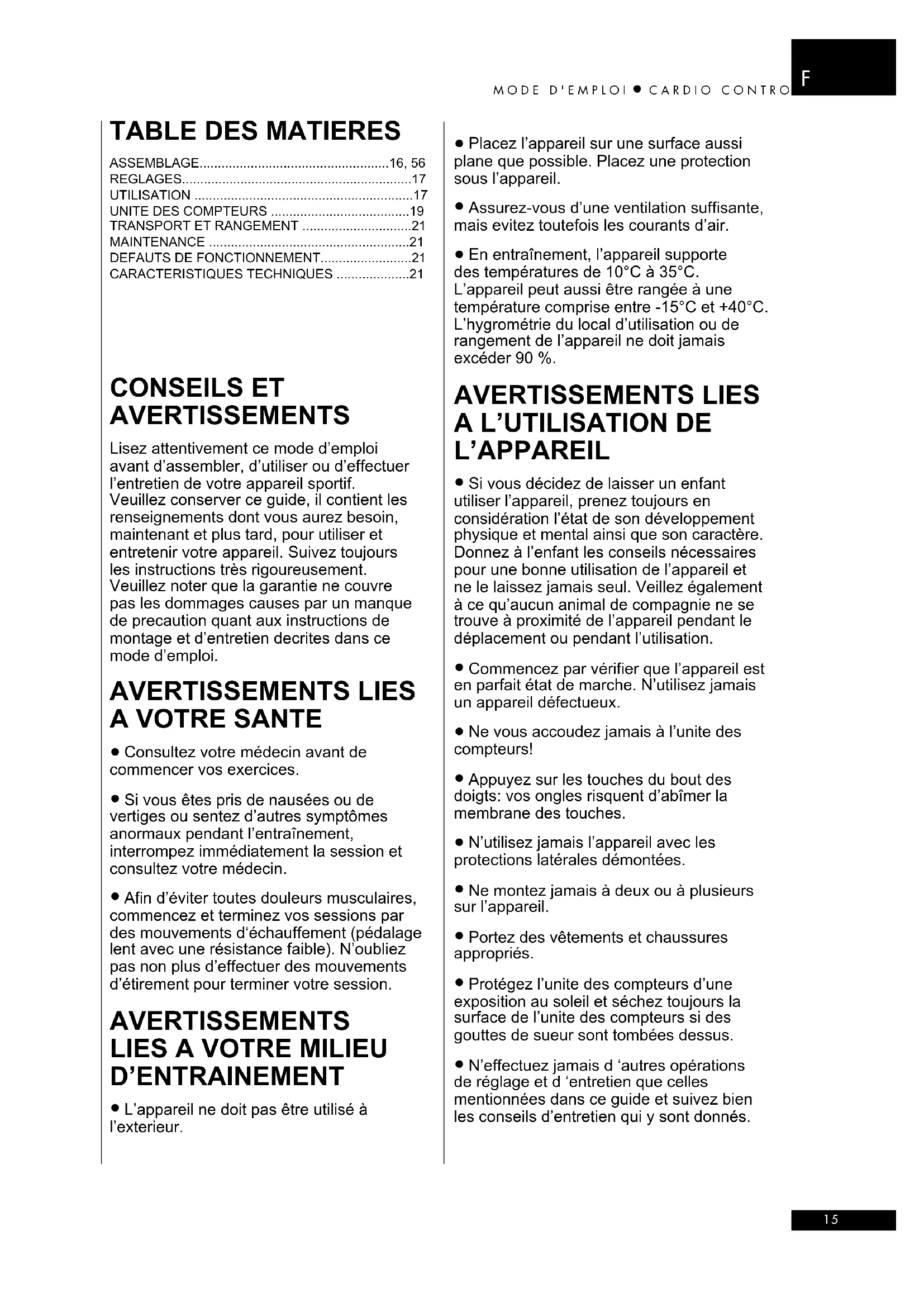 - En entraînement, l'appareil supporte des températures de 10^ à 35^ . L'appareil peut aussi être rangée à une température comprise entre -15^ et +40^ . L'hygrométrie du local d'utilisation ou de rangement de l'appareil ne doit jamais excéder 90% .