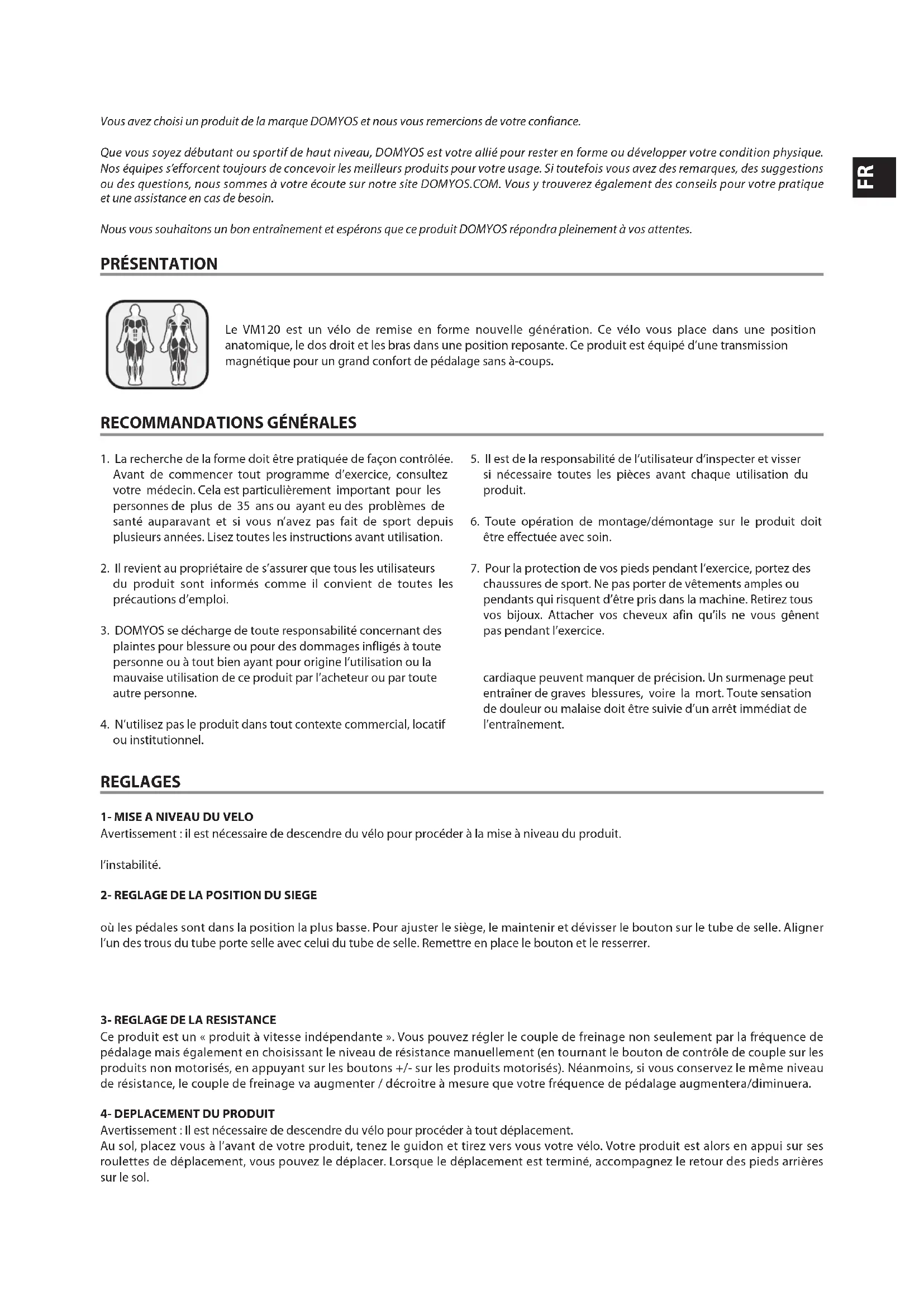 8FR Vous avez choisi un produit de la marque DOMYOS et nous vous remercions de votre confiance. Que vous soyez débutant ou sportif de haut niveau, DOMYOS est votre allié pour rester en forme ou développer votre condition physique. Nos équipes s’efforcent toujours de concevoir les meilleurs produits pour votre usage. Si toutefois vous avez des remarques, des suggestions ou des questions, nous sommes à votre écoute sur notre site DOMYOS.COM. Vous y trouverez également des conseils pour votre pratique et une assistance en cas de besoin. Nous vous souhaitons un bon entraînement et espérons que ce produit DOMYOS répondra pleinement à vos attentes. PRÉSENTATION Le VM120 est un vélo de remise en forme nouvelle génération. Ce vélo vous place dans une position anatomique, le dos droit et les bras dans une position reposante. Ce produit est équipé d’une transmission magnétique pour un grand confort de pédalage sans à-coups.