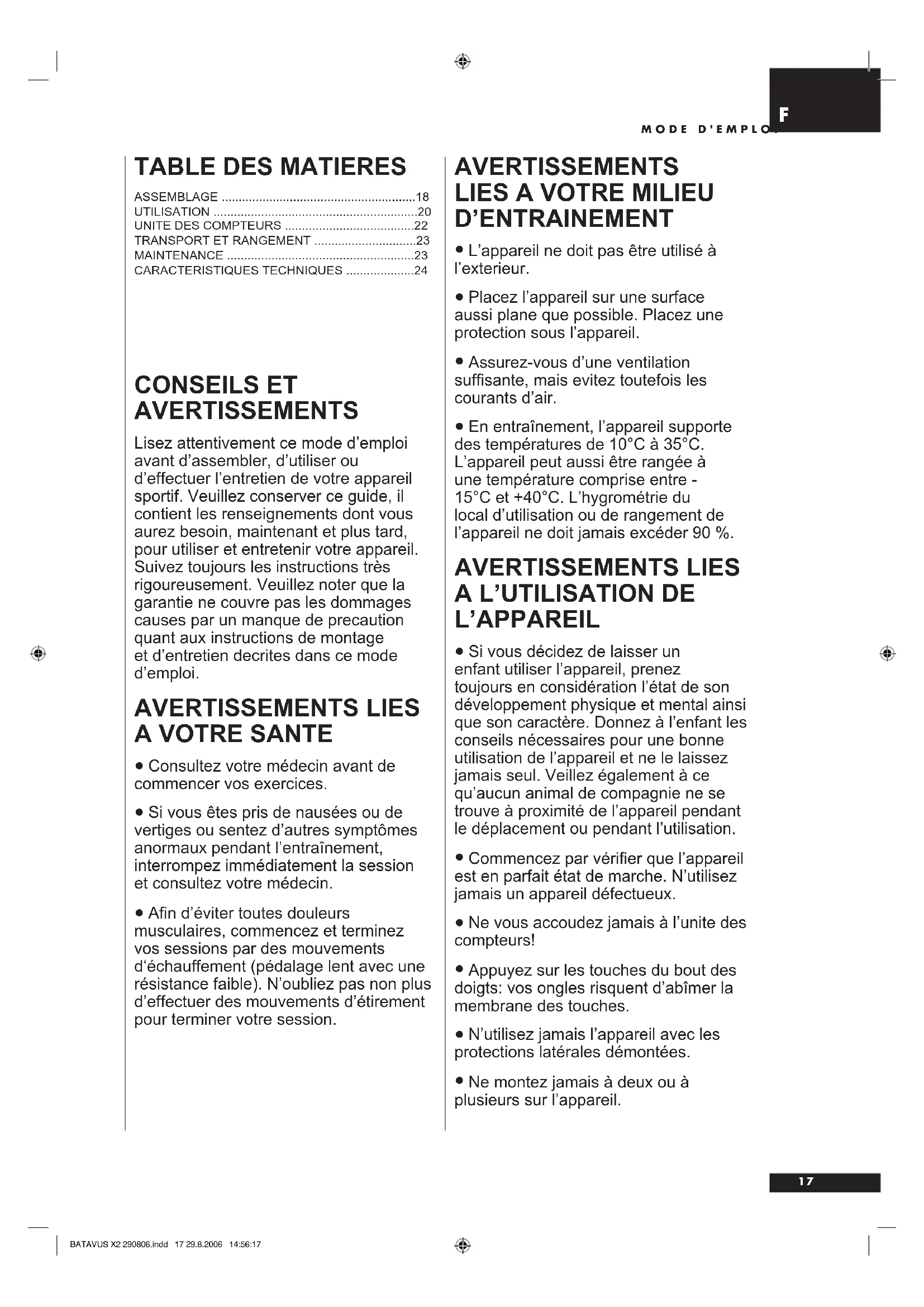 - Cet appareil peut être utilisé à la maison. La garantie de la societe Batavus ne couvre que les defauts ou imperfections s'etant manifestes pendant l'utilisation à la maison (24 mois). Pour information complémentaire sur la garantie de votre équipement de fitness, veuillez consulter la brochure de garantie livrée avec l'appareil.