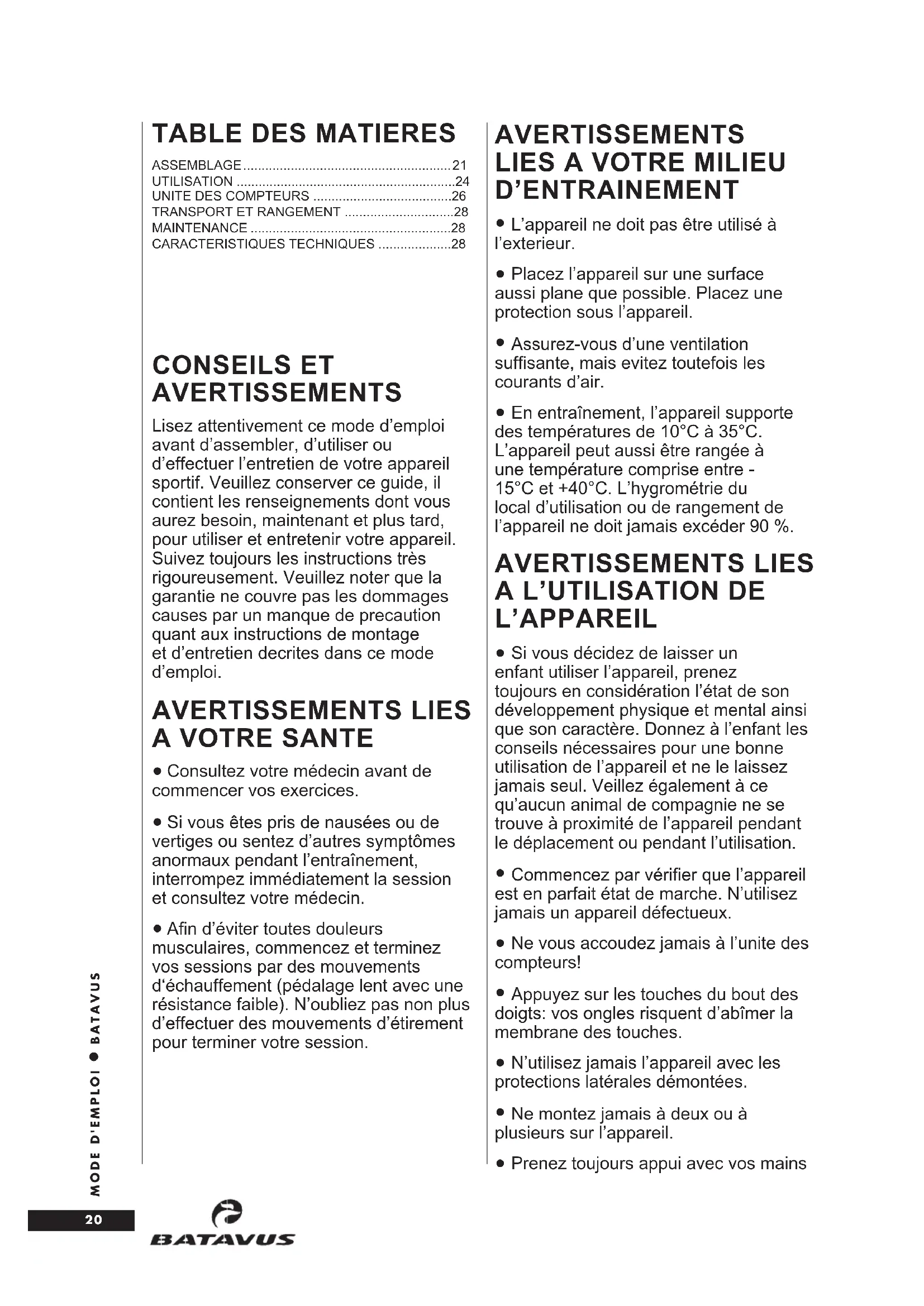 Lisez attentivement ce mode d'emploi avant d'assembler, d'utiliser ou d'effectuer l'entretien de votre apparéil sportif. Veuillez conservece guide, il contient les renseignements dont vous aurez besoin, maintainant et plus tard, pour utiliser et entrenir votre apparéil. Suivez toujours les instructions très rigoureusement. Veuillez notes que la garantie ne couvre pas les dommages causes par un manque de précaution quant aux instructions de montage et d'entretien décrites dans ce mode d'emploi.