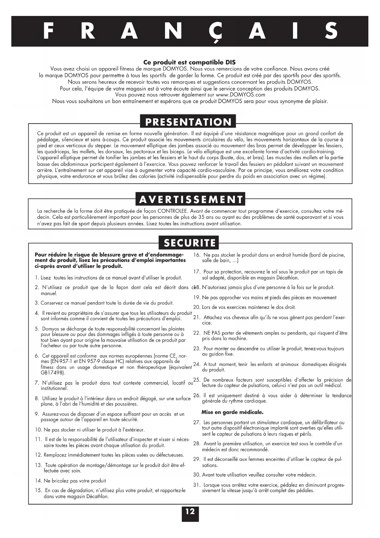 - 12 Ce produit est compatible DIS Vous avez choisi un appareil fitness de marque DOMYOS. Nous vous remercions de votre confiance. Nous avons créé la marque DOMYOS pour permettre à tous les sportifs de garder la forme. Ce produit est créé par des sportifs pour des sportifs. Nous serons heureux de recevoir toutes vos remarques et suggestions concernant les produits DOMYOS. Pour cela, l’équipe de votre magasin est à votre écoute ainsi que le service conception des produits DOMYOS. Vous pouvez nous retrouver également sur www.DOMYOS.com Nous vous souhaitons un bon entraînement et espérons que ce produit DOMYOS sera pour vous synonyme de plaisir. Ce produit est un appareil de remise en forme nouvelle génération. Il est équipé d’une résistance magnétique pour un grand confort de pédalage, silencieux et sans à-coups. Ce produit associe les mouvements circulaires du vélo, les mouvements horizontaux de la course à pied et ceux verticaux du stepper. Le mouvement elliptique des jambes associé au mouvement des bras permet de développer les fessiers, les quadriceps, les mollets, les dorsaux, les pectoraux et les biceps. Le vélo elliptique est une excellente forme d’activité cardio-training. L’appareil elliptique permet de tonifier les jambes et les fessiers et le haut du corps (buste, dos, et bras). Les muscles des mollets et la partie basse des abdominaux participent également à l’exercice. Vous pouvez renforcer le travail des fessiers en pédalant suivant un mouvement arrière. L’entraînement sur cet appareil vise à augmenter votre capacité cardio-vasculaire. Par ce principe, vous améliorez votre condition physique, votre endurance et vous brûlez des calories (activité indispensable pour perdre du poids en association avec un régime). PRESENTATION Pour réduire le risque de blessure grave et d’endommage-ment du produit, lisez les précautions d’emploi importantes ci-après avant d’utiliser le produit.1. Lisez toutes les instructions de ce manuel avant d’utiliser le produit.2. N’utilisez ce produit que de la façon dont cela est décrit dans ce manuel.3. Conservez ce manuel pendant toute la durée de vie du produit.4. Il revient au propriétaire de s’assurer que tous les utilisateurs du produit sont informés comme il convient de toutes les précautions d’emploi.5. Domyos se décharge de toute responsabilité concernant les plaintes pour blessure ou pour des dommages infligés à toute personne ou à tout bien ayant pour origine la mauvaise utilisation de ce produit par l’acheteur ou par toute autre personne.6. Cet appareil est conforme aux normes européennes (norme CE, nor-mes (EN-957-1 et EN 957-9 classe HC) relatives aux appareils de fitness dans un usage domestique et non thérapeutique (équivalent GB17498). 7. N’utilisez pas le produit dans tout contexte commercial, locatif ou institutionnel.8. Utilisez le produit à l’intérieur dans un endroit dégagé, sur une surface plane, à l’abri de l’humidité et des poussières.9. Assurez-vous de disposer d’un espace suffisant pour un accès et un passage autour de l’appareil en toute sécurité.10. Ne pas stocker ni utiliser le produit à l’extérieur.11. Il est de la responsabilité de l’utilisateur d’inspecter et visser si néces-saire toutes les pièces avant chaque utilisation du produit.12. Remplacez immédiatement toutes les pièces usées ou défectueuses.13. Toute opération de montage/démontage sur le produit doit être ef-fectuée avec soin.14. Ne bricolez pas votre produit15. En cas de dégradation, n’utilisez plus votre produit, et rapportez-le dans votre magasin Décathlon.16. Ne pas stocker le produit dans un endroit humide (bord de piscine, salle de bain, …)17. Pour sa protection, recouvrez le sol sous le produit par un tapis de sol adapté, disponible en magasin Décathlon.18. N’autorisez jamais plus d’une personne à la fois sur le produit.19. Ne pas approcher vos mains et pieds des pièces en mouvement20. Lors de vos exercices maintenez le dos droit.21. Attachez vos cheveux afin qu’ils ne vous gênent pas pendant l’exer-cice.22. NE PAS porter de vêtements amples ou pendants, qui risquent d’être pris dans la machine.23. Pour monter ou descendre ou utiliser le produit, tenez-vous toujours au guidon fixe.24. A tout moment, tenir les enfants et animaux domestiques éloignés du produit.25. De nombreux facteurs sont susceptibles d’affecter la précision de lecture du capteur de pulsations, celui-ci n’est pas un outil médical.26. Il est uniquement destiné à vous aider à déterminer la tendance générale du rythme cardiaque. Mise en garde médicale.27. Les personnes portant un stimulateur cardiaque, un défibrillateur ou tout autre dispositif électronique implanté sont averties qu’elles utili-sent le capteur de pulsations à leurs risques et périls. 28. Avant la première utilisation, un exercice test sous le contrôle d’un médecin est donc recommandé.29. Il est déconseillé aux femmes enceintes d’utiliser le capteur de pul-sations.30. Avant toute utilisation veuillez consulter votre médecin.31. Lorsque vous arrêtez votre exercice, pédalez en diminuant progres-sivement la vitesse jusqu’à arrêt complet des pédales. SECURITE FRANÇAIS La recherche de la forme doit être pratiquée de façon CONTROLEE. Avant de commencer tout programme d’exercice, consultez votre mé- decin. Cela est particulièrement important pour les personnes de plus de 35 ans ou ayant eu des problèmes de santé auparavant et si vous n’avez pas fait de sport depuis plusieurs années. Lisez toutes les instructions avant utilisation. AVERTISSEMENT13 FRANÇAIS