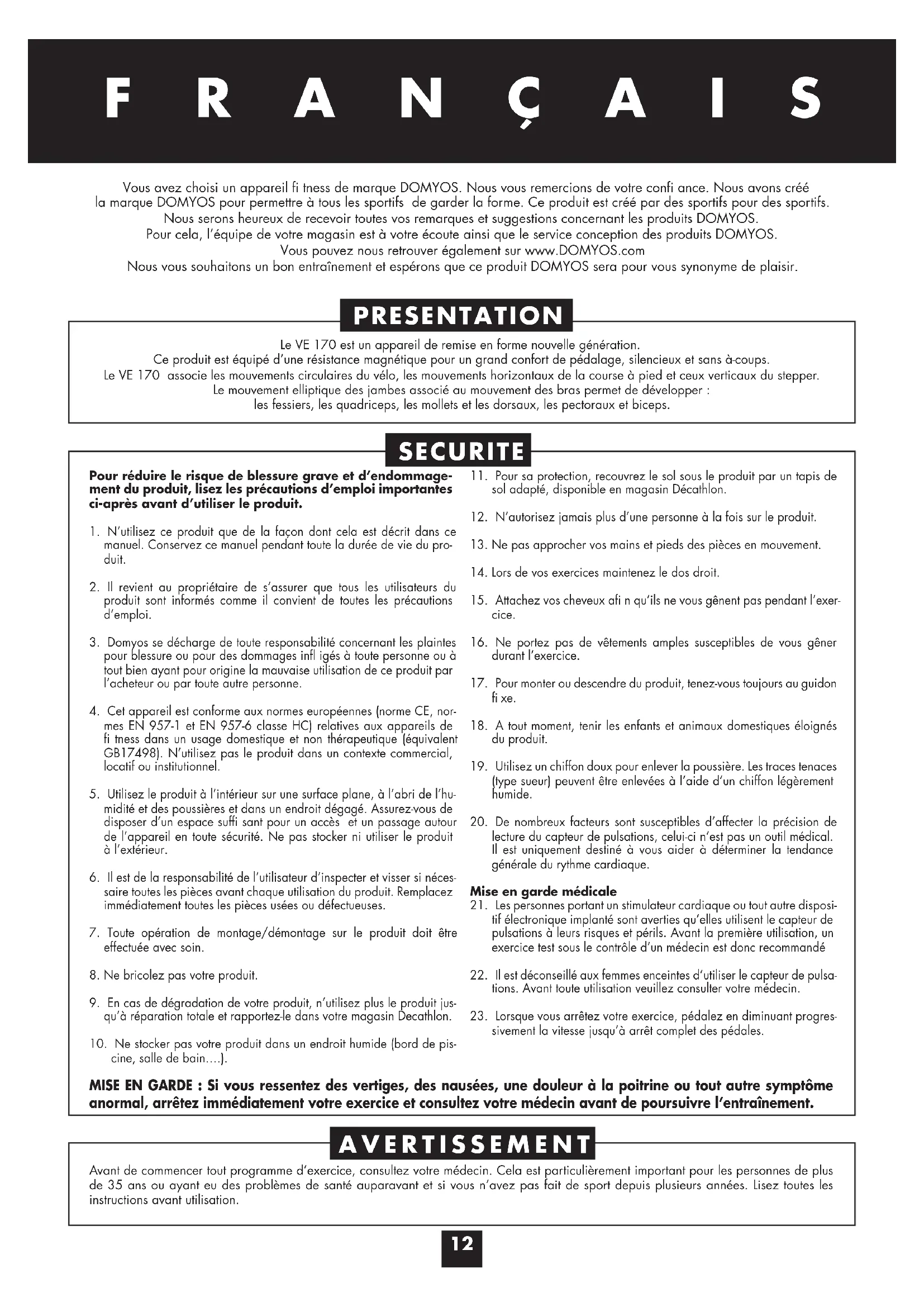 MODE D'EMPLOI VE 170 DOMYOS