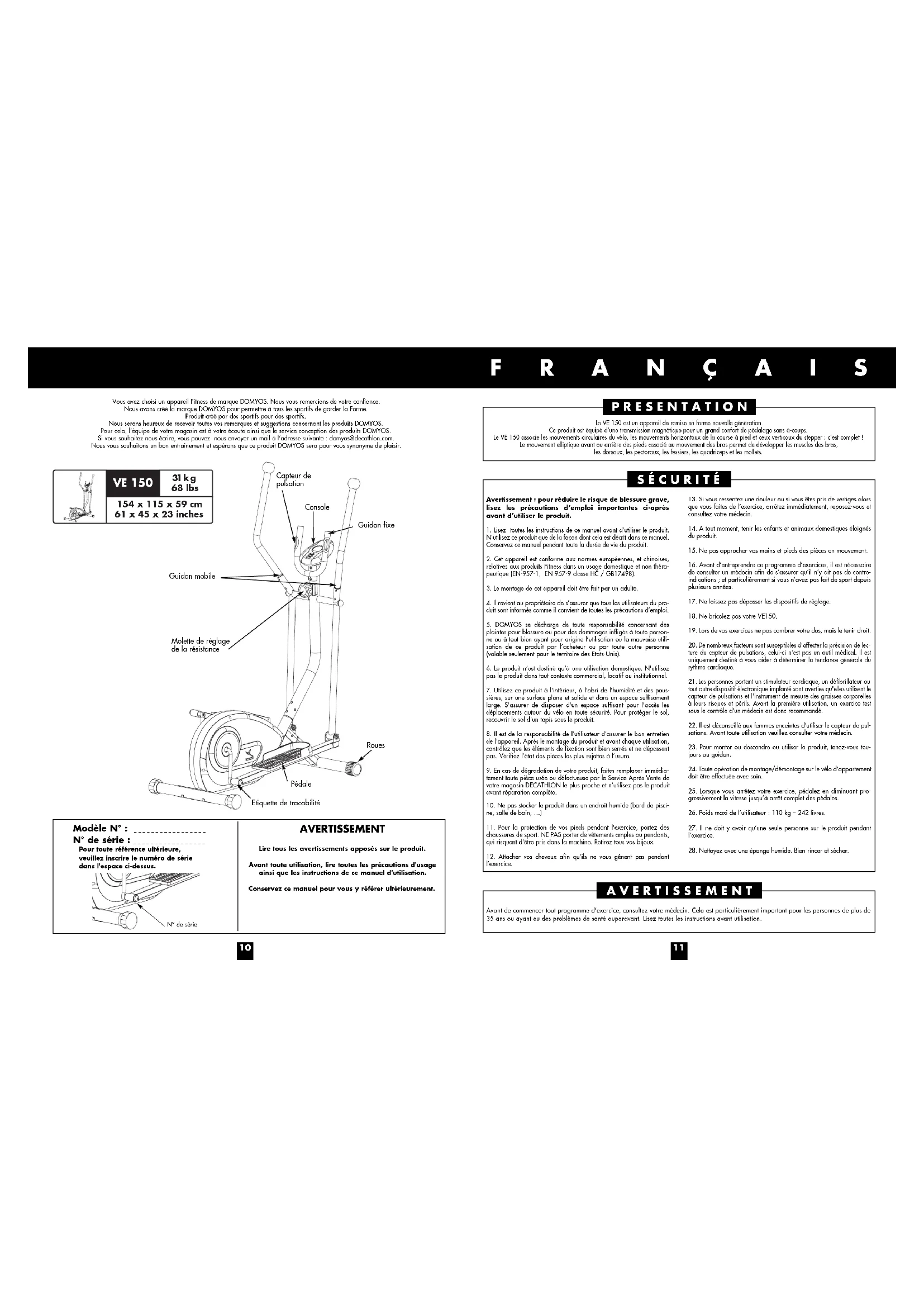 SÉCURITÉ Le VE 150 est un appareil de remise en forme nouvelle génération.Ce produit est équipé d’une transmission magnétique pour un grand confort de pédalage sans à-coups. Le VE 150 associe les mouvements circulaires du vélo, les mouvements horizontaux de la course à pied et ceux verticaux du stepper : c’est complet ! Le mouvement elliptique avant ou arrière des pieds associé au mouvement des bras permet de développer les muscles des bras, les dorsaux, les pectoraux, les fessiers, les quadriceps et les mollets. PRESENTATION Avant de commencer tout programme d’exercice, consultez votre médecin. Cela est particulièrement important pour les personnes de plus de 35 ans ou ayant eu des problèmes de santé auparavant. Lisez toutes les instructions avant utilisation. AVERTISSEMENT Vous avez choisi un appareil Fitness de marque DOMYOS. Nous vous remercions de votre confiance.Nous avons créé la marque DOMYOS pour permettre à tous les sportifs de garder la Forme. Produit créé par des sportifs pour des sportifs. Nous serons heureux de recevoir toutes vos remarques et suggestions concernant les produits DOMYOS. Pour cela, l’équipe de votre magasin est à votre écoute ainsi que le service conception des produits DOMYOS. Si vous souhaitez nous écrire, vous pouvez nous envoyer un mail à l’adresse suivante : domyos@decathlon.com.Nous vous souhaitons un bon entraînement et espérons que ce produit DOMYOS sera pour vous synonyme de plaisir. Modèle N° : _ _ _ _ _ _ _ _ _ _ _ _ _ _ _ _ _ N° de série : _ _ _ _ _ _ _ _ _ _ _ _ _ _ _ _ _ Pour toute référence ultérieure, veuillez inscrire le numéro de série dans l'espace ci-dessus. AVERTISSEMENT Lire tous les avertissements apposés sur le produit.Avant toute utilisation, lire toutes les précautions d'usage ainsi que les instructions de ce manuel d'utilisation.Conservez ce manuel pour vous y référer ultérieurement.N° de sérieRouesEtiquette de tracabilitéGuidon mobileGuidon fixeCapteur depulsationConsoleMolette de réglagede la résistancePédaleAvertissement : pour réduire le risque de blessure grave,lisez les précautions d’emploi importantes ci-aprèsavant d’utiliser le produit.1. Lisez toutes les instructions de ce manuel avant d’utiliser le produit.N’utilisez ce produit que de la façon dont cela est décrit dans ce manuel.Conservez ce manuel pendant toute la durée de vie du produit.2. Cet appareil est conforme aux normes européennes, et chinoises,relatives aux produits Fitness dans un usage domestique et non théra-peutique (EN-957-1, EN 957-9 classe HC / GB17498).3. Le montage de cet appareil doit être fait par un adulte. 4. Il revient au propriétaire de s’assurer que tous les utilisateurs du pro-duit sont informés comme il convient de toutes les précautions d’emploi.5. DOMYOS se décharge de toute responsabilité concernant desplaintes pour blessure ou pour des dommages infligés à toute person-ne ou à tout bien ayant pour origine l’utilisation ou la mauvaise utili-sation de ce produit par l’acheteur ou par toute autre personne(valable seulement pour le territoire des Etats-Unis).6. Le produit n’est destiné qu’à une utilisation domestique. N'utilisezpas le produit dans tout contexte commercial, locatif ou institutionnel.7. Utilisez ce produit à l'intérieur, à l'abri de l'humidité et des pous-sières, sur une surface plane et solide et dans un espace suffisamentlarge. S'assurer de disposer d'un espace suffisant pour l'accès lesdéplacements autour du vélo en toute sécurité. Pour protéger le sol,recouvrir le sol d’un tapis sous le produit. 8. Il est de la responsabilité de l’utilisateur d’assurer le bon entretiende l’appareil. Après le montage du produit et avant chaque utilisation,contrôlez que les éléments de fixation sont bien serrés et ne dépassentpas. Vérifiez l’état des pièces les plus sujettes à l’usure. 9. En cas de dégradation de votre produit, faites remplacer immédia-tement toute pièce usée ou défectueuse par le Service Après Vente devotre magasin DECATHLON le plus proche et n’utilisez pas le produitavant réparation complète.10. Ne pas stocker le produit dans un endroit humide (bord de pisci-ne, salle de bain, …)11. Pour la protection de vos pieds pendant l'exercice, portez deschaussures de sport. NE PAS porter de vêtements amples ou pendants,qui risquent d'être pris dans la machine. Retirez tous vos bijoux. 12. Attacher vos cheveux afin qu’ils ne vous gênent pas pendantl’exercice.13. Si vous ressentez une douleur ou si vous êtes pris de vertiges alorsque vous faites de l’exercice, arrêtez immédiatement, reposez-vous etconsultez votre médecin.14. A tout moment, tenir les enfants et animaux domestiques éloignésdu produit.15. Ne pas approcher vos mains et pieds des pièces en mouvement.16. Avant d’entreprendre ce programme d’exercices, il est nécessairede consulter un médecin afin de s’assurer qu’il n’y ait pas de contre-indications ; et particulièrement si vous n’avez pas fait de sport depuisplusieurs années.17. Ne laissez pas dépasser les dispositifs de réglage.18. Ne bricolez pas votre VE150.19. Lors de vos exercices ne pas cambrer votre dos, mais le tenir droit. De nombreux facteurs sont susceptibles d'affecter la précision de lec-ture du capteur de pulsations, celui-ci n'est pas un outil médical. Il estuniquement destiné à vous aider à déterminer la tendance générale durythme cardiaque. Les personnes portant un stimulateur cardiaque, un défibrillateur outout autre dispositif électronique implanté sont averties qu'elles utilisent lecapteur de pulsations et l'instrument de mesure des graisses corporellesà leurs risques et périls. Avant la première utilisation, un exercice testsous le contrôle d'un médecin est donc recommandé.22. Il est déconseillé aux femmes enceintes d’utiliser le capteur de pul-sations. Avant toute utilisation veuillez consulter votre médecin.2