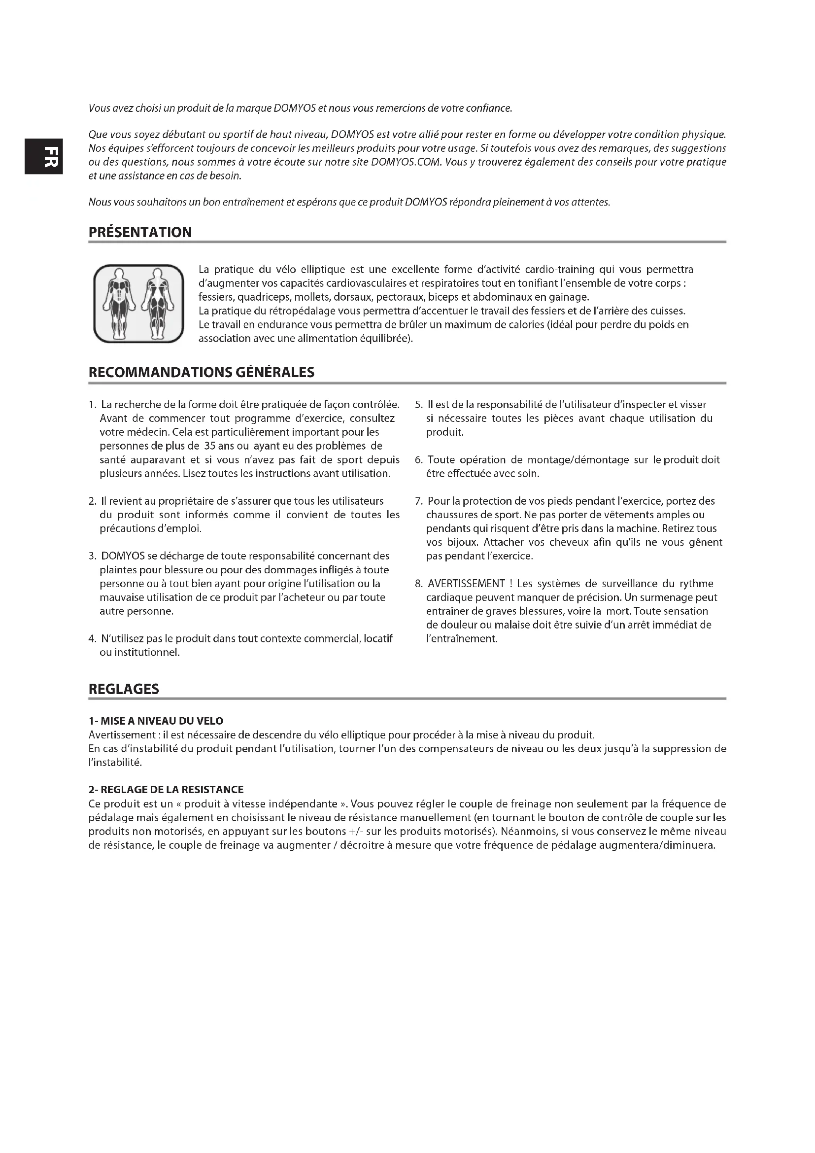 11FR Vous avez choisi un produit de la marque DOMYOS et nous vous remercions de votre confiance. Que vous soyez débutant ou sportif de haut niveau, DOMYOS est votre allié pour rester en forme ou développer votre condition physique. Nos équipes s’efforcent toujours de concevoir les meilleurs produits pour votre usage. Si toutefois vous avez des remarques, des suggestions ou des questions, nous sommes à votre écoute sur notre site DOMYOS.COM. Vous y trouverez également des conseils pour votre pratique et une assistance en cas de besoin. Nous vous souhaitons un bon entraînement et espérons que ce produit DOMYOS répondra pleinement à vos attentes. PRÉSENTATION La pratique du vélo elliptique est une excellente forme d’activité cardio-training qui vous permettra d’augmenter vos capacités cardiovasculaires et respiratoires tout en tonifiant l’ensemble de votre corps : fessiers, quadriceps, mollets, dorsaux, pectoraux, biceps et abdominaux en gainage. La pratique du rétropédalage vous permettra d’accentuer le travail des fessiers et de l’arrière des cuisses. Le travail en endurance vous permettra de brûler un maximum de calories (idéal pour perdre du poids en association avec une alimentation équilibrée).