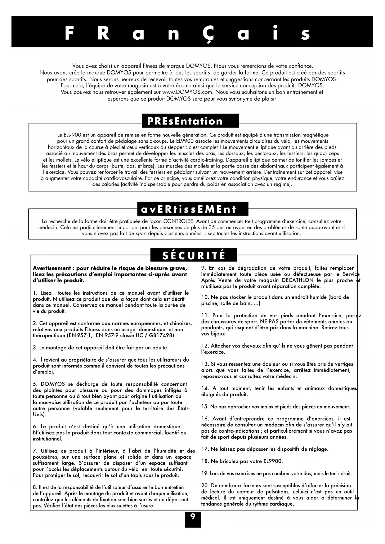 FRançais Vous avez choisi un appareil tness de marque DOMYOS. Nous vous remercions de votre conance. Nous avons crée la marque DOMYOS pour permettre à tous les sportifs de garder la forme. Ce produit est créé par des sportifs pour des sportifs. Nous serons heureux de recevoir toutes vos remarques et suggestions concernant les produits DOMYOS. Pour cela, l’équipe de votre magasin est à votre écoute ainsi que le service conception des produits DOMYOS. Vous pouvez nous retrouver également sur www.DOMYOS.com. Nous vous souhaitons un bon entraînement et espérons que ce produit DOMYOS sera pour vous synonyme de plaisir. Le EL9900 est un appareil de remise en forme nouvelle génération. Ce produit est équipé d’une transmission magnétique pour un grand confort de pédalage sans à-coups. Le EL9900 associe les mouvements circulaires du vélo, les mouvements horizontaux de la course à pied et ceux verticaux du stepper : c’est complet ! Le mouvement elliptique avant ou arrière des pieds associé au mouvement des bras permet de développer les muscles des bras, les dorsaux, les pectoraux, les fessiers, les quadriceps et les mollets. Le vélo elliptique est une excellente forme d’activité cardio-training. L’appareil elliptique permet de tonier les jambes et les fessiers et le haut du corps (buste, dos, et bras). Les muscles des mollets et la partie basse des abdominaux participent également à l’exercice. Vous pouvez renforcer le travail des fessiers en pédalant suivant un mouvement arrière. L’entraînement sur cet appareil vise à augmenter votre capacité cardio-vasculaire. Par ce principe, vous améliorez votre condition physique, votre endurance et vous brûlez des calories (activité indispensable pour perdre du poids en association avec un régime). PREsEntation La recherche de la forme doit être pratiquée de façon CONTROLEE. Avant de commencer tout programme d’exercice, consultez votre médecin. Cela est particulièrement important pour les personnes de plus de 35 ans ou ayant eu des problèmes de santé auparavant et si vous n’avez pas fait de sport depuis plusieurs années. Lisez toutes les instructions avant utilisation. avERtissEMEnt