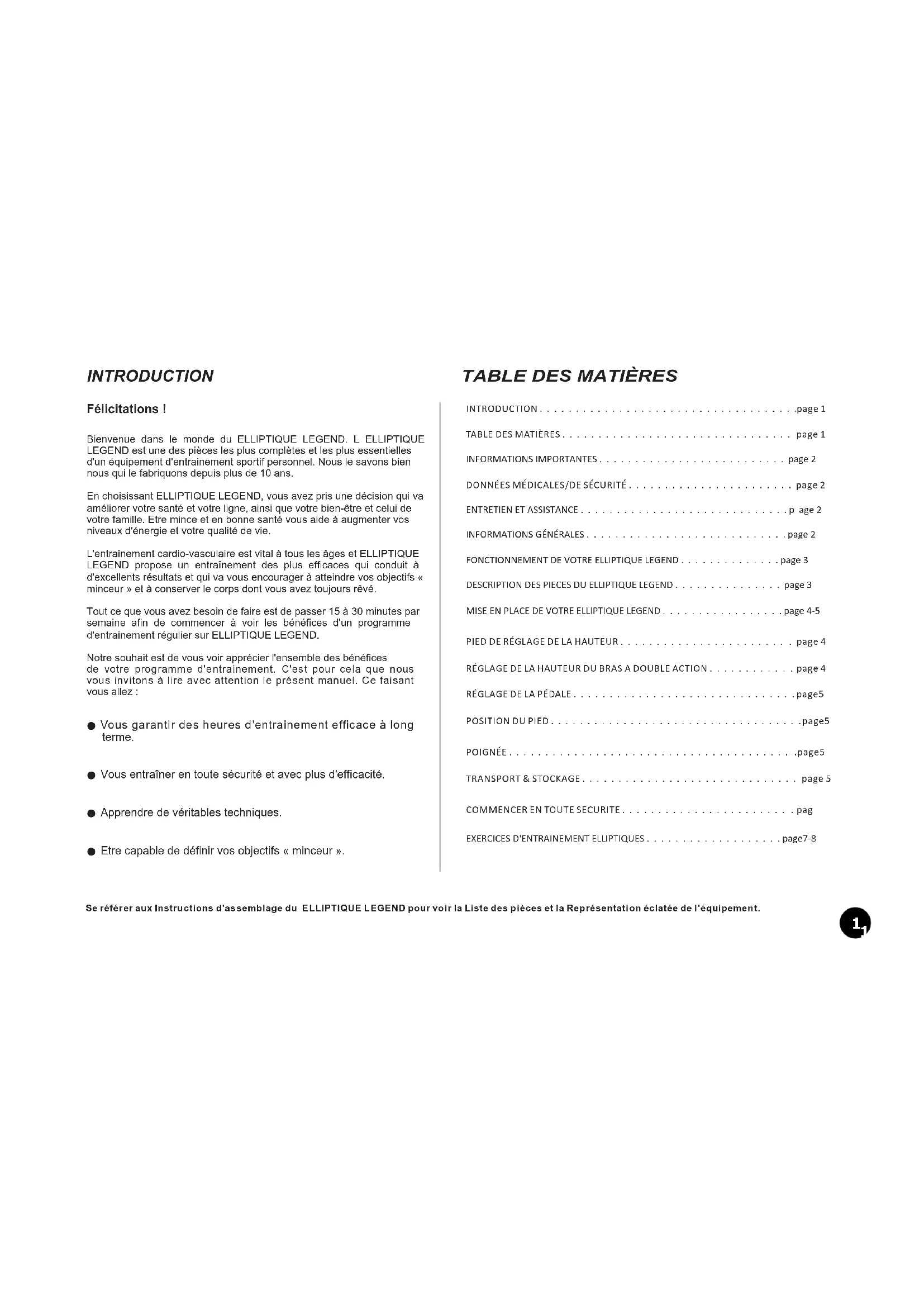 DESCRIPTION DES PIECES DU ELLIPTIQUE LEGEND . . . . . . . . . . . . . . . . page 3