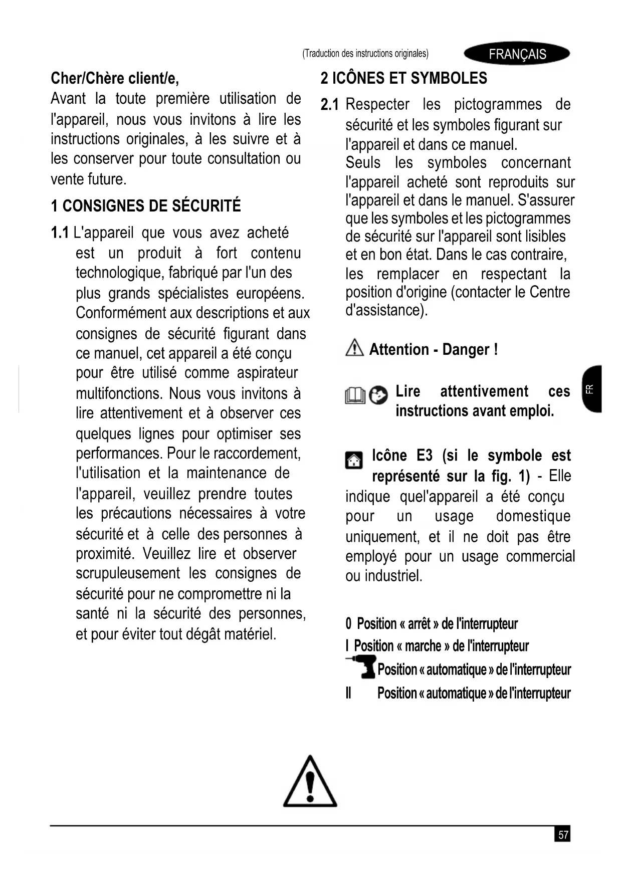 Respecter les pictogrammes de sécurité et les symboles figurant sur l'appareil et dans ce manuel. Seuls les symboles concernant l'appareil acheté sont reproduits sur l'appareil et dans le manuel. S'assurer que les symboles et les pictogrammes de sécurité sur l'appareil sont lisibles et en bon état. Dans le cas contraire, les remplacer en respectant la position d'origine (contacter le Centre d'assistance). Attention - Danger ! Lire attentivement ces instructions avant emploi. Icône E3 (si le symbole est représenté sur la fig. 1) - Elle indique quel'appareil a été conçu pour un usage domestique uniquement, et il ne doit pas être employé pour un usage commercial ou industriel. 0 Position « arrêt » de l'interrupteur I Position « marche » de l'interrupteur Position « automatique » de l'interrupteur II Position « automatique » de l'interrupteur58 FRANÇAIS (Traduction des instructions originales)