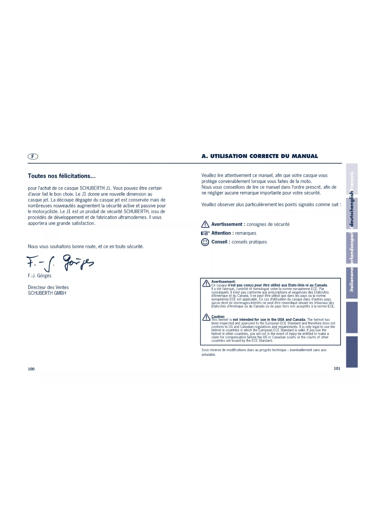 Headquarters phone Address +49 (0)391 8106-0 SCHUBERTH Gruppe Stegelitzer Str. 12 39126 Magdeburg Germany Service Center phone Address +49 (0)391 8106-555 SCHUBERTH GmbH Service Center Stegelitzer Str. 12 39126 Magdeburg Germany Internet www.schuberth.com E-mail kundenservice@schuberth.com SH_MAN_J1_10_10_V01_EN_SH05011_Manual_J1_V07_GB.qxd 03.11.10 12:34 Seite 98Toutes nos félicitations... pour l’achat de ce casque SCHUBERTH J1. Vous pouvez être certain d’avoir fait le bon choix. Le J1 donne une nouvelle dimension au casque jet. La découpe dégagée du casque jet est conservée mais de nombreuses nouveautés augmentent la sécurité active et passive pour le motocycliste. Le J1 est un produit de sécurité SCHUBERTH, issu de procédés de développement et de fabrication ultramodernes. Il vous apportera une grande satisfaction. Nous vous souhaitons bonne route, et ce en toute sécurité. F.-J. Görges Directeur des Ventes SCHUBERTH GMBH