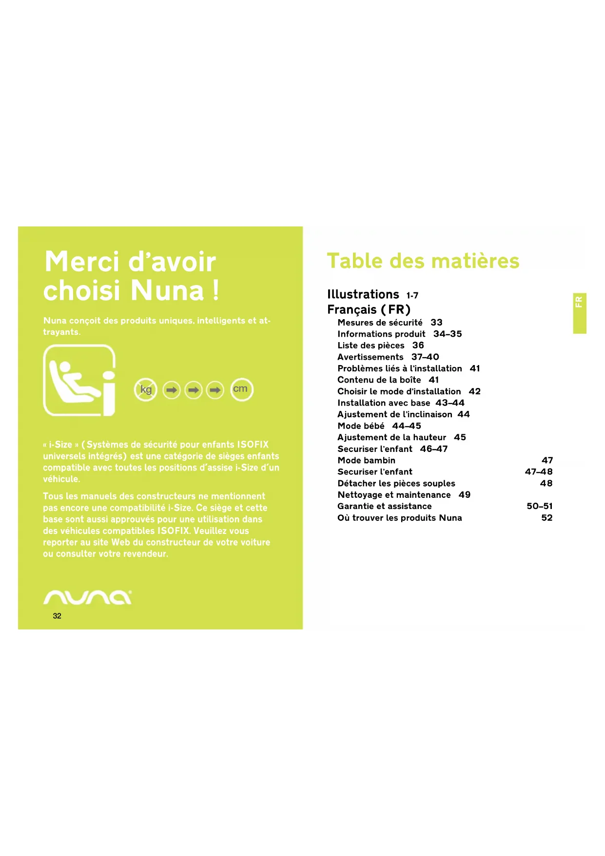 Le siège enfant Nuna est couvert par une garantie d'un an. Si ce produit montre des signes de défaillance durant la période de garantie, veiliez contacter votre revendeur. Si le revendeur n'est pas en mesure de vous aider, il prendra contact avec le distributeur Nuna local.