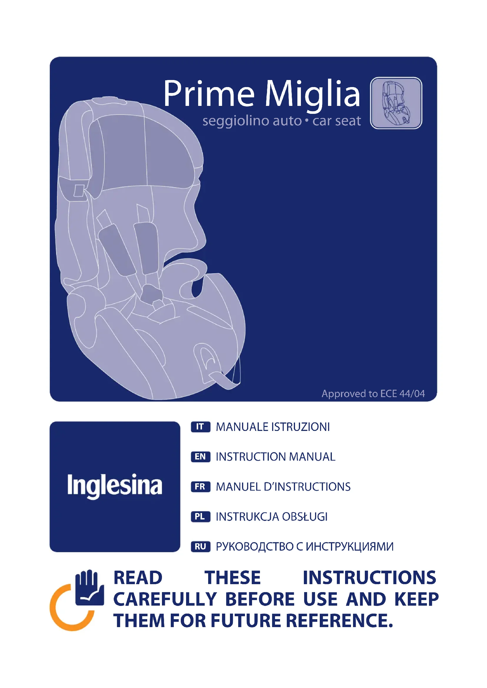 Cher client, merci d’avoir choisi le siège auto Prime Miglia. Comme tout parent le sait, la sécurité de notre enfant est vitale quand on voyage en auto. Rien n’est plus important que de savoir son enfant en sécurité et protégé durant le voyage. C’est pour cette raison que tous les sièges auto Inglesina sont rigoureusement testés en conformité avec les plus récents «Standards de Sécurité Européens». Pour être homologué par ces «Standards», chaque siège passe une série de tests très sévères. informations sur le produit Ce siège a été conçu et testé pour s’adapter aux plus récentes normes européennes pour les sièges des groupes 1, 2 et 3. Ce siège a été conçu pour les enfants pesant entre 9 et 36 kg, âgés de 9 mois à 11 ans environ. Tous les âges indiqués sont approximatifs parce que les enfants grandissent de façon différente, par conséquent le poids est le véritable indice de référence.5 Prime Miglia fotelik Szanowny Kliencie, dziækujemy za wybranie fotelika. Tak jak wszyscy rodzice wiedzà, bezpieczeñstwo dzieci podczas jazdy samochodem ma ýyciowe znaczenie. Z tego teý powodu fotelik Prime Miglia zostaù homologowany zgodnie z najnowszymi Europejskimi Standardami Bezpieczeñstwa i przeszedù szereg surowych testów. informacje o produkcie Ten fotelik zostaù zaprojektowany i testowany, aby dostosowaã siæ do najnowszych norm europejskich dotyczàcych fotelików grup 1, 2 i 3. Ten fotelik zostaù zaprojektowany dla dzieci o wadze zawartej miædzy 9 i 36 kg, w przedziale wiekowym orientacyjnie od 9 miesiæcy do 11 lat. Wiek jest podany orientacyjnie, poniewaý dzieci rosnà w róýny sposób, dlatego teý prawdziwym punktem odniesienia jest waga.àâòîìîáèëÿ Prime Miglia
