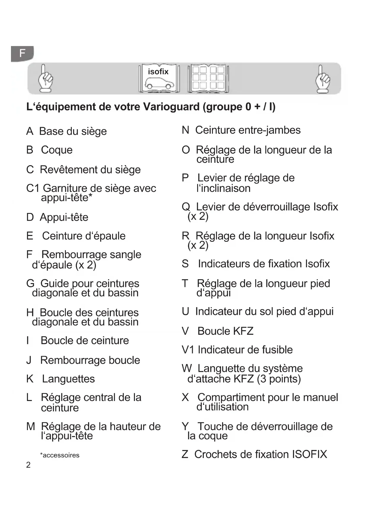 A Base du siège B Coque C Revêtement du siège C1 Garniture de siège avec appui-tête* D Appui-tête E Ceinture d‘épaule F Rembourrage sangle d‘épaule (x 2) G Guide pour ceintures diagonale et du bassin H Boucle des ceintures diagonale et du bassin I Boucle de ceinture J Rembourrage boucle K Languettes L Réglage central de la ceinture M Réglage de la hauteur de l‘appui-tête L‘équipement de votre Varioguard (groupe 0 + / I) N Ceinture entre-jambes O Réglage de la longueur de la ceinture P Levier de réglage de l‘inclinaison Q Levier de déverrouillage Isox (x 2) R Réglage de la longueur Isox (x 2) S Indicateurs de xation Isox T Réglage de la longueur pied d‘appui U Indicateur du sol pied d‘appui V Boucle KFZ V1 Indicateur de fusible W Languette du système d‘attache KFZ (3 points) X Compartiment pour le manuel d‘utilisation Y Touche de déverrouillage de la coque Z Crochets de xation ISOFIX isofix *accessoires3