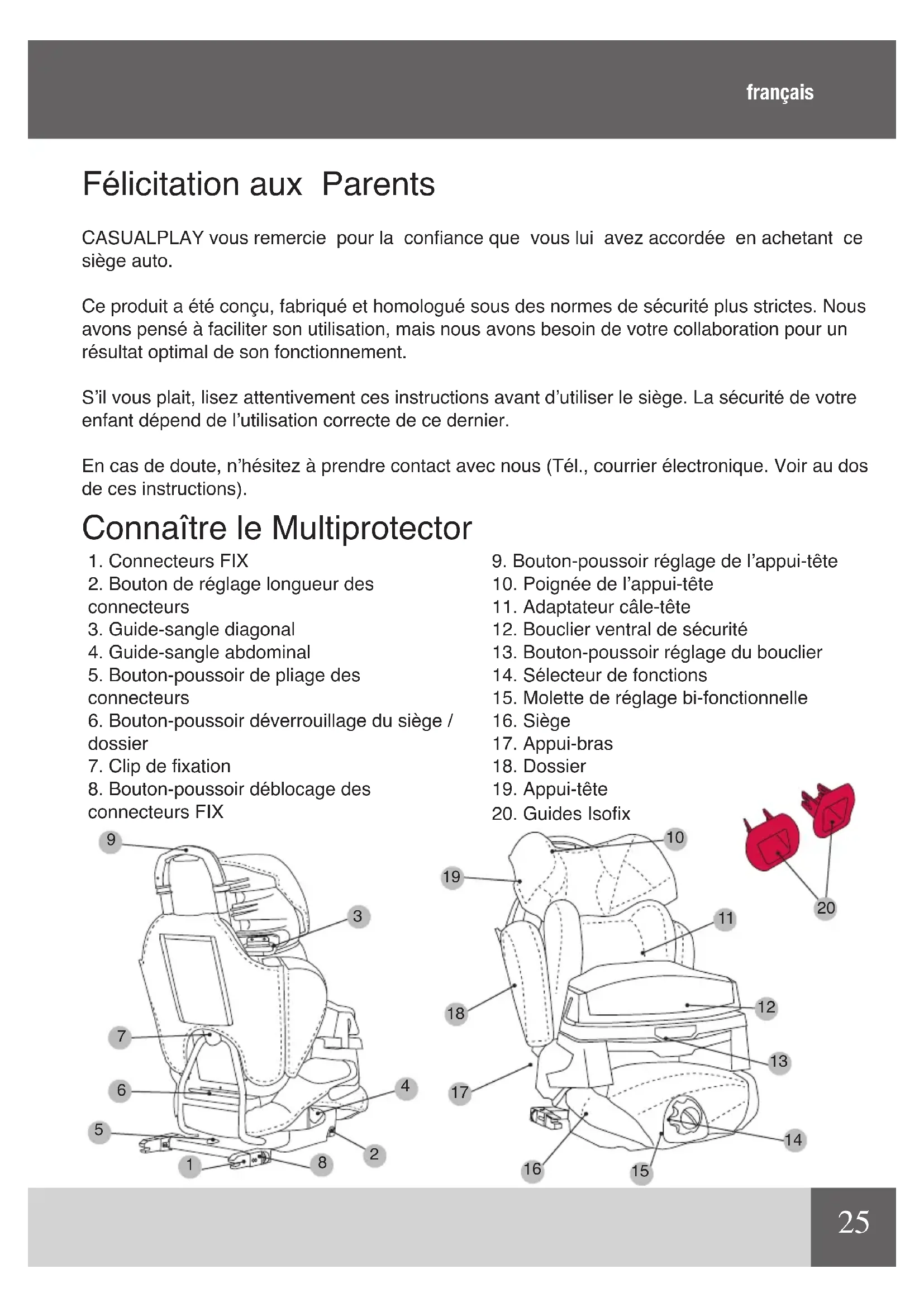 Félicitation aux Parents CASUALPLAY vous remercie pour la conance que vous lui avez accordée en achetant ce siège auto. Ce produit a été conçu, fabriqué et homologué sous des normes de sécurité plus strictes. Nous avons pensé à faciliter son utilisation, mais nous avons besoin de votre collaboration pour un résultat optimal de son fonctionnement. S’il vous plait, lisez attentivement ces instructions avant d’utiliser le siège. La sécurité de votre enfant dépend de l’utilisation correcte de ce dernier. En cas de doute, n’hésitez à prendre contact avec nous (Tél., courrier électronique. Voir au dos de ces instructions). Connaître le Multiprotector français26 IMPORTANT Utilisation appropriée uniquement dans les véhicules équipés d’une ceinture à trois points avec rétracteur, approuvée par la UN/ECE-16 ou standard équivalent. AVIS