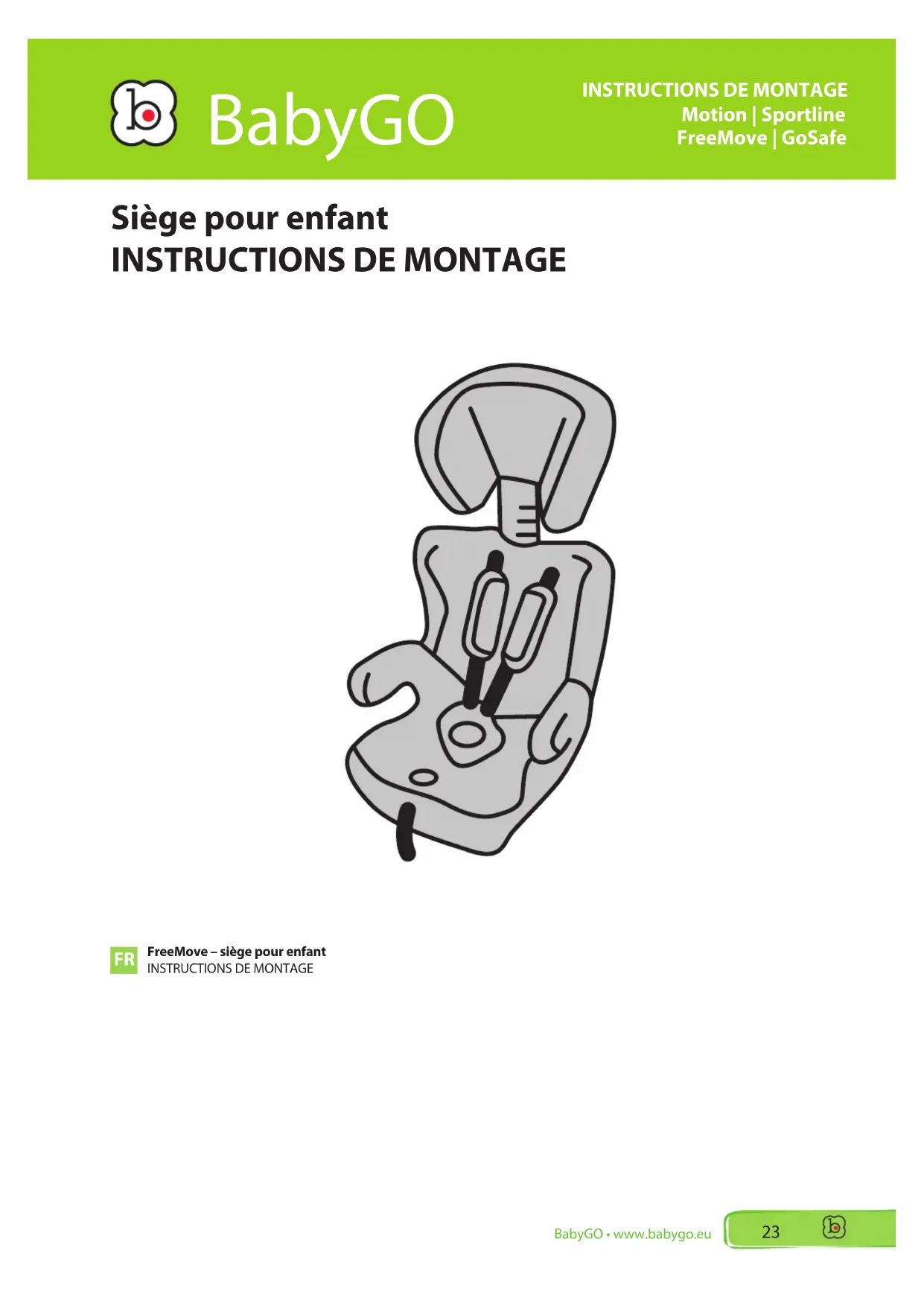 Motion | Sportline FreeMove | GoSafe Dans le véhicule, le siège enfant peut être installé dans les positions suivantes.Face à la route OuiDos à la route NonAvec des ceintures à 2 points NonAvec des ceintures à 3 points OuiSur le siège avant NonSur les deux places arrières latérales OuiSur la place arrière centrale (ceinture à 2 points) NonSur un siège transversal NonSur un siège supplémentaire Non Eléments du siège auto pour enfant Coussin d’assiseFermoir Base Appuie-têteCoussin de nuqueHousse de diègeProtection d’épauleSangles d’épauleBouton rouge du fermoirCoussinet de protection du fermoirRéglage du harnaisSangle de réglage du harnaisBouton rouge de l’appuie-têteTendeur de l’appuie-têteFente de sangle d’épauleSangle d’épauleGuide de ceintureBoucle métalliqueDossier27 BabyGO • www.babygo.eu BabyGO