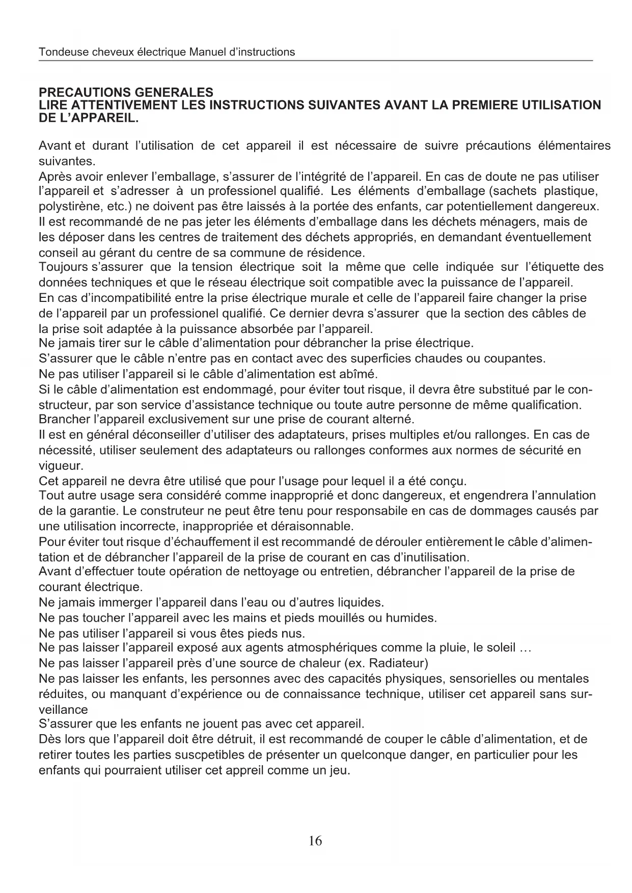Lorsque que la tondeuse à cheveux est en marche, ne pas toucher les parties en mouvement ou chiude, ne pas tenter d'enlever oumettre des accessoires. Ne pas utiliser d'accessoires différents de ceux qui vosu sont fournis. Un nettoyage régulier et un bon entretien vous assureront de mêleurs résultats et une durée de vie plus longue de votre apparéil. Enlever toujours le cable d'alimentation de la prise de courant avant de procéder au nettoyage de la tondeuse à cheveux. Ne pas utiliser la tondeuse à cheveux s'il est endommagé; s'adresser au fabricant ou centre spécialisé.