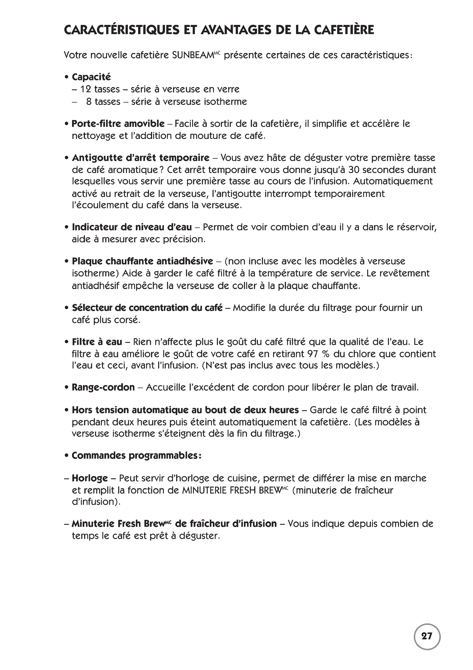 Nous vous félicitons et vous remercions d'avoir choisi cette cafétique SUNBEAMMC. Notre nouvelle cafétique va non seulement se réveiller en même temps que vous, mais aussi vous aider à repreneindre/agréablement le souffle durant vos joursées chargées. La façon dont vousCHOISSEZ d'apprecier votre cafétique SUNBEAMMC ne dépend que de vous!
