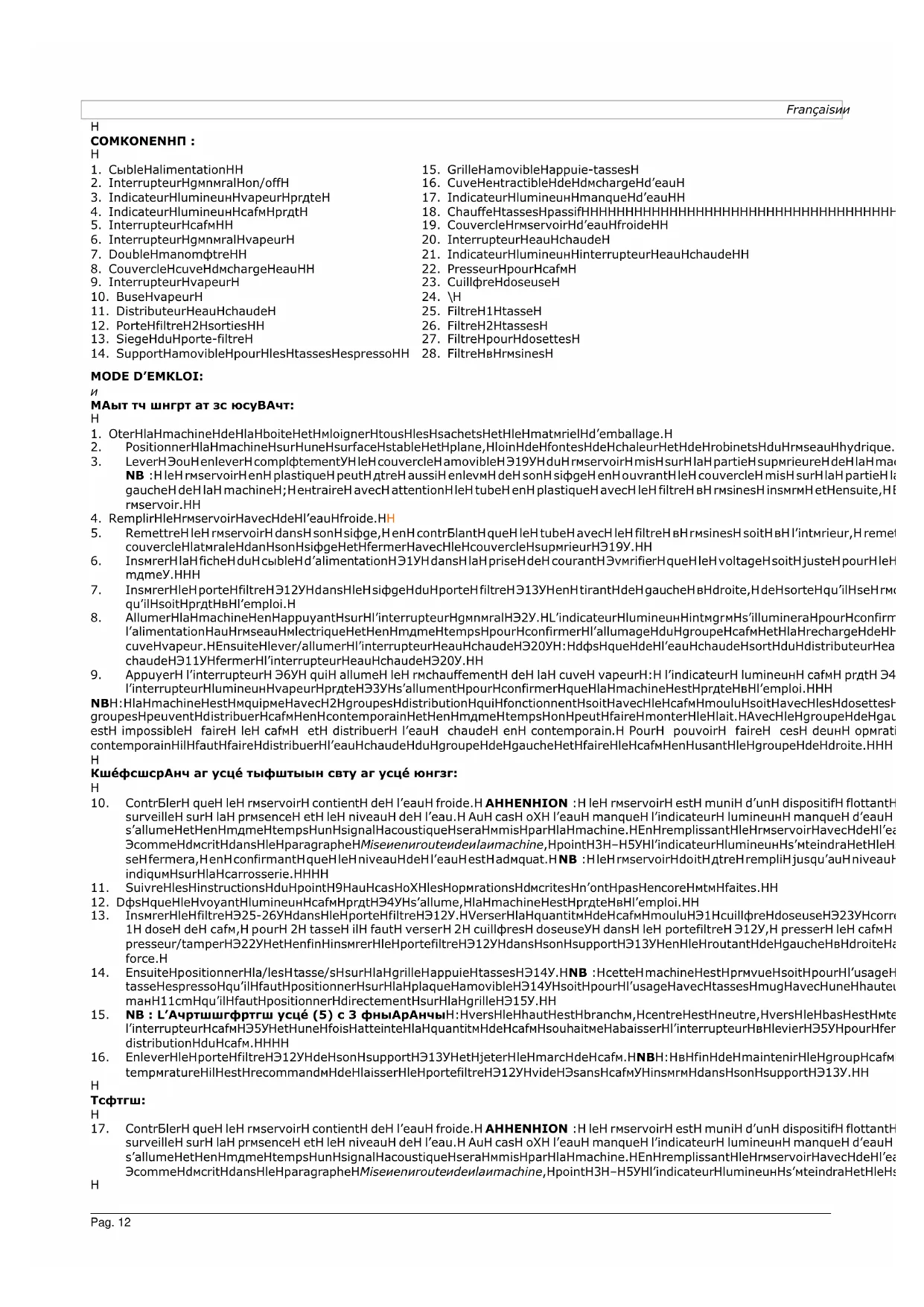 26. Mettre un bocal sous le distributeur d’eau chaude (11) et lever l’interrupteur eau chaude (20). Le voyant lumineux (21) confirme l’allumage. Lorsque la quantité d’eau souhaitée est atteinte, abaisser l’interrupteur eau chaude (20) pour fermer la distribution. 27. Après le prélèvement d’eau chaude, il est recommandé de contrôler que le réservoir contient de l’eau et si nécessaire de le remplir comme indiqué au point 24. ENTRETIEN COURANT ET PRECAUTIONS : - Il est conseillé de nettoyer, après chaque utilisation, la buse de vapeur (10). - Pour le nettoyage, utiliser un chiffon humidifié d’eau. - Ne pas exposer l’appareil aux agents atmosphériques. - Ne pas plonger l’appareil dans l’eau. - Ne faire fonctionner l’appareil que sous le contrôle des adultes et le tenir hors de la portée des enfants. - Ne pas laver filtre et porte filtre dans la machine à laver la vaisselle. - Pendant le normal fonctionnement de la machine certaines parties de la carrosserie peuvent atteindre de hautes températures : manœuvrer avec attention ! Note Bien : La machine est prévue avec un réservoir d’eau avec une capacité de 2,7lt, muni d’un dispositif d’alarme au cas de manque d’eau lié à une alarme acoustique (buzzer). Le son du buzzer pour signaler le manque d’eau au moment de l’allumage de la machine est divers du son émis pour signaler le manque d’eau pendant le normal fonctionnement. Le remplissage du réservoir déterminera la coupure du voyant alarme (17) et aussi du son du buzzer. Si l’eau finit pendant le fonctionnement ordinaire le révélateur manque d’eau laisse 15sec. de temps pour faire le café ; une fois finit la distribution du café il est conseillé de remplir le réservoir jusqu’au niveau max. indiqué. Il est recommandé de lire avec attention le manuel d’instructions et de contrôler périodiquement le niveau de l’eau dans le réservoir interne. Filtre à résines en dotation (inséré sur le tube charge eau, à l’intérieur du réservoir) : il sert afin de protéger le mécanisme interne contre les résidus de calcaire ; il s’agit d’un adoucisseur à usage unique spécifique pour les machines à café qu’il faut changer en suivant le degré de dureté et le consume de l’eau comme décrit dans la table ci-dessous : Dureté de l’eau Quantité 10°F 90 litres 20°F 45 litres 27°F 35 litres 35°F 23 litres 45°F 20 litres NB : il faut changer le filtre après le consume de la quantité d’eau indiquée dans la table ci-dessus, autrement les résidus de calcaire peuvent endommager la machine (dommage non couvert par la garantie).