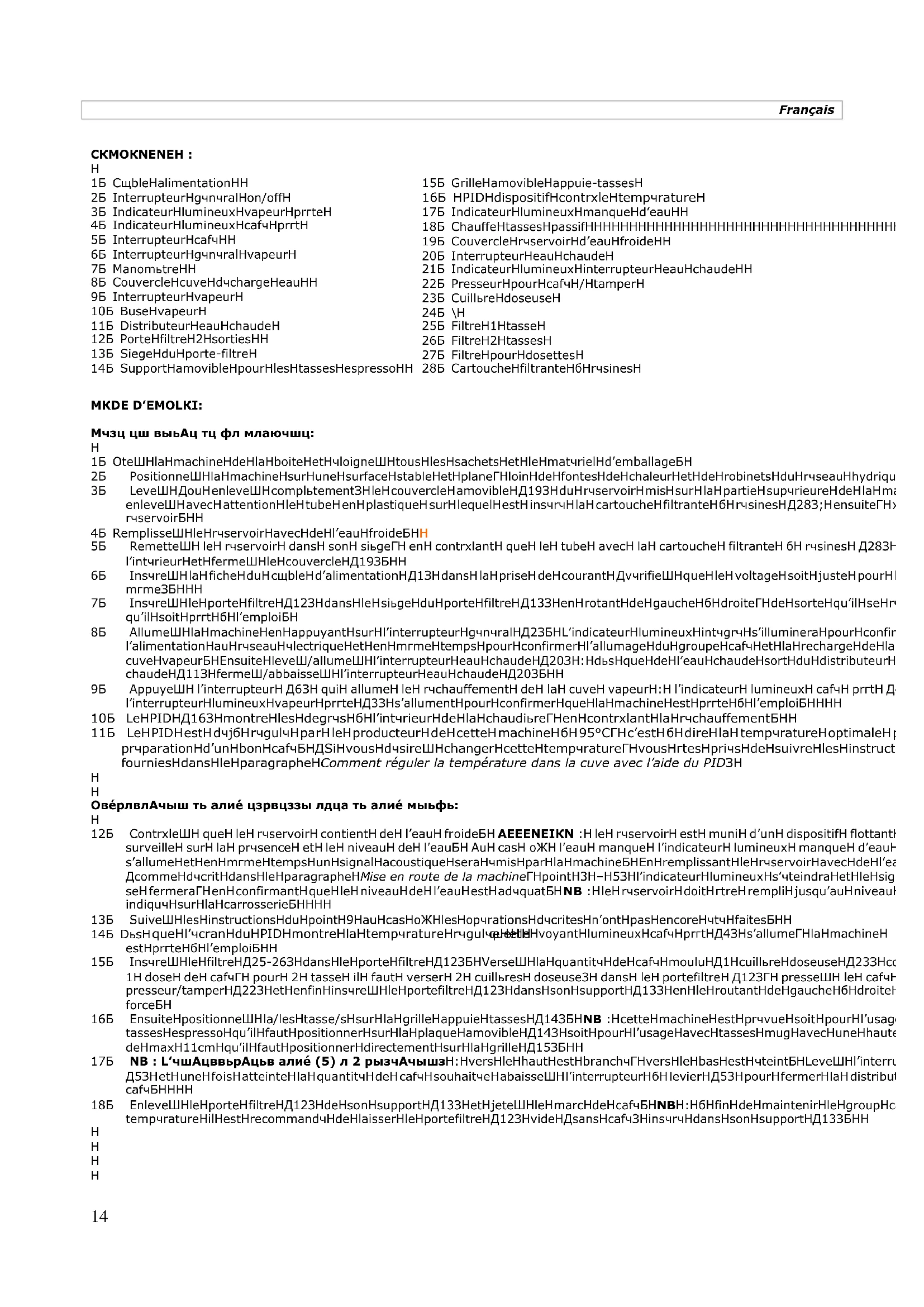 Note Bien : La machine est prévue avec un réservoir d’eau avec une capacité de 2,7lt, muni d’un dispositif d’alarme au cas de manque d’eau lié à une alarme acoustique (buzzer). Le son du buzzer pour signaler le manque d’eau au moment de l’allumage de la machine est divers du son émis pour signaler le manque d’eau pendant le normal fonctionnement. Le remplissage du réservoir déterminera la coupure du voyant alarme (17) et aussi du son du buzzer. Si l’eau finit pendant le fonctionnement ordinaire le révélateur manque d’eau laisse 15sec. de temps pour faire le café ; une fois finit la distribution du café il est conseillé de remplir le réservoir jusqu’au niveau max. indiqué. Il est recommandé de lire avec attention le manuel d’instructions et de contrôler périodiquement le niveau de l’eau dans le réservoir interne.16