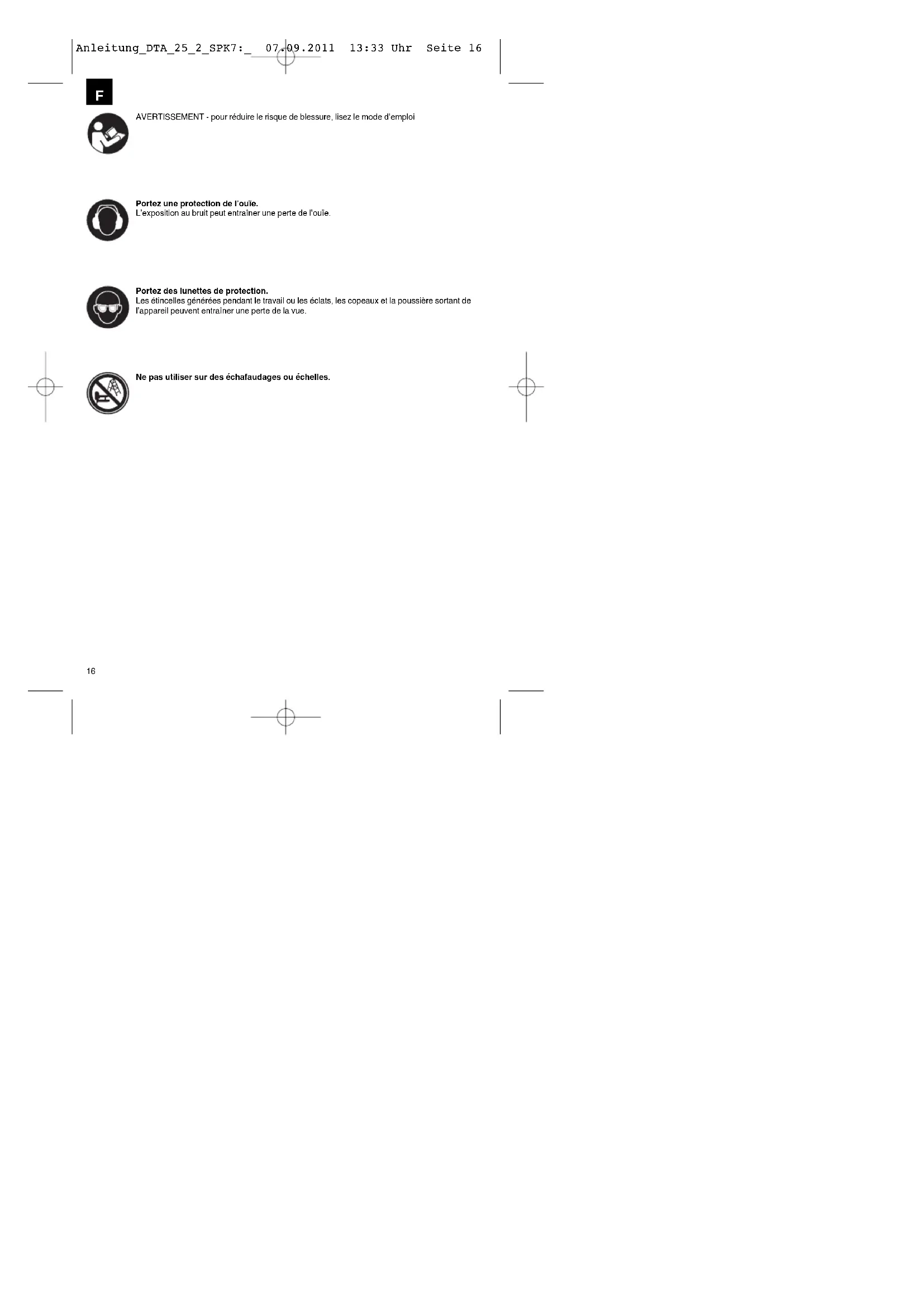 AVERTISSEMENT - pour réduire le risque de blessure, lisez le mode d’emploi Portez une protection de l’ouïe. L’exposition au bruit peut entraîner une perte de l’ouïe. Portez des lunettes de protection. Les étincelles générées pendant le travail ou les éclats, les copeaux et la poussière sortant de l’appareil peuvent entraîner une perte de la vue. Ne pas utiliser sur des échafaudages ou échelles. Anleitung_DTA_25_2_SPK7:_ 07.09.2011 13:33 Uhr Seite 1617