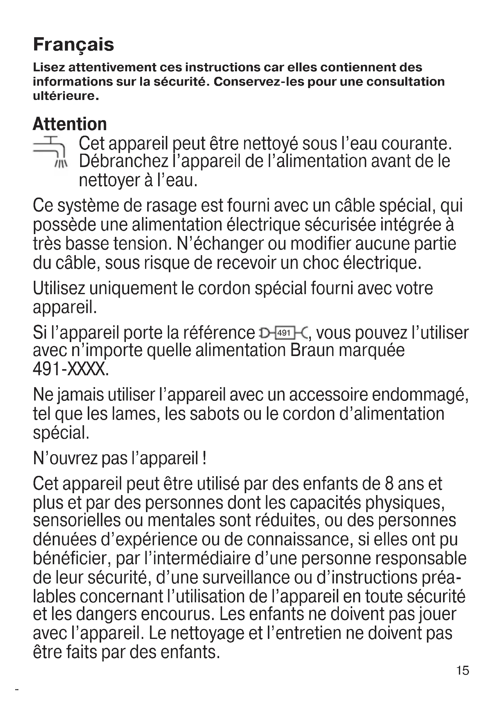 , vous pouvez l’utiliser avec n’importe quelle alimentation Braun marquée 491-XXXX. Ne jamais utiliser l’appareil avec un accessoire endommagé, tel que les lames, les sabots ou le cordon d’alimentation spécial. N’ouvrez pas l’appareil ! Cet appareil peut être utilisé par des enfants de 8 ans et plus et par des personnes dont les capacités physiques, sensorielles ou mentales sont réduites, ou des personnes dénuées d’expérience ou de connaissance, si elles ont pu bénéficier, par l’intermédiaire d’une personne responsable de leur sécurité, d’une surveillance ou d’instructions préa- lables concernant l’utilisation de l’appareil en toute sécurité et les dangers encourus. Les enfants ne doivent pas jouer avec l’appareil. Le nettoyage et l’entretien ne doivent pas être faits par des enfants. 90640279_BT_3242_3241_3240_3940_MN_ANZ.indd 1590640279_BT_3242_3241_3240_3940_MN_ANZ.indd 15 15.05.19 10:2615.05.19 10:26 Business Use - P&G AUTHORIZED POA-00132899 Rev 001 Effective Date 2019-05-23 Printed 2020-10-06 Page 15 of 5216 Description 1a Sabot de précision barbe (1–10 mm) 1b Sabot de précision cheveux (11–20 mm)* 2 Tête de tondeuse 3 Molette de réglage de la hauteur du sabot 4 Bouton marche/arrêt 5 Témoin de charge 6 Prise d’alimentation 7 Cordon d’alimentation spécial (le design peut varier)