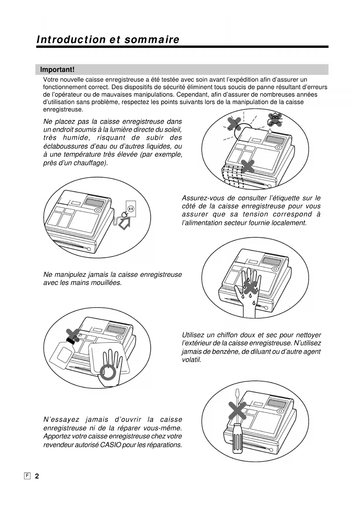 Ne placez pas la caisse enregistreuse dans un endroit soumis à la lumière directe du soleil, très humide, risquant de subir des éclaboussures d’eau ou d’autres liquides, ou à une température très élevée (par exemple, près d’un chauffage). N’essayez jamais d’ouvrir la caisse enregistreuse ni de la réparer vous-même. Apportez votre caisse enregistreuse chez votre revendeur autorisé CASIO pour les réparations. Utilisez un chiffon doux et sec pour nettoyer l’extérieur de la caisse enregistreuse. N’utilisez jamais de benzène, de diluant ou d’autre agent volatil. Ne manipulez jamais la caisse enregistreuse avec les mains mouillées. Assurez-vous de consulter l’étiquette sur le côté de la caisse enregistreuse pour vous assurer que sa tension correspond à l’alimentation secteur fournie localement. Important! Votre nouvelle caisse enregistreuse a été testée avec soin avant l’expédition afin d’assurer un fonctionnement correct. Des dispositifs de sécurité éliminent tous soucis de panne résultant d’erreurs de l’opérateur ou de mauvaises manipulations. Cependant, afin d’assurer de nombreuses années d’utilisation sans problème, respectez les points suivants lors de la manipulation de la caisse enregistreuse. Introduction et sommaireIntroduction et sommaire