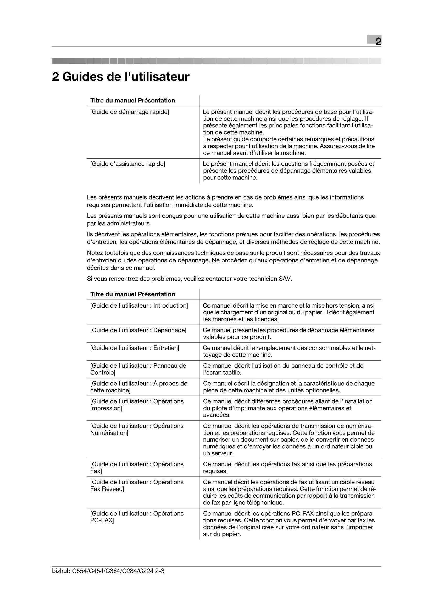 1Bienvenue Nous vous remercions d'avoir acheté cet appareil. Ce guide de l'utilisateur décrit les fonctions, les instructions de service, les précautions d'utilisation et les procédures de dépannage élémentaires relatives à cette machine. Pour tirer le maximum de ce produit et apprendre à l'utiliser efficacement, veuillez lire ce guide de l'utilisateur selon les besoins.1 1-4 bizhub C554/C454/C364/C284/C2242 Guides de l'utilisateurbizhub C554/C454/C364/C284/C224 2-3